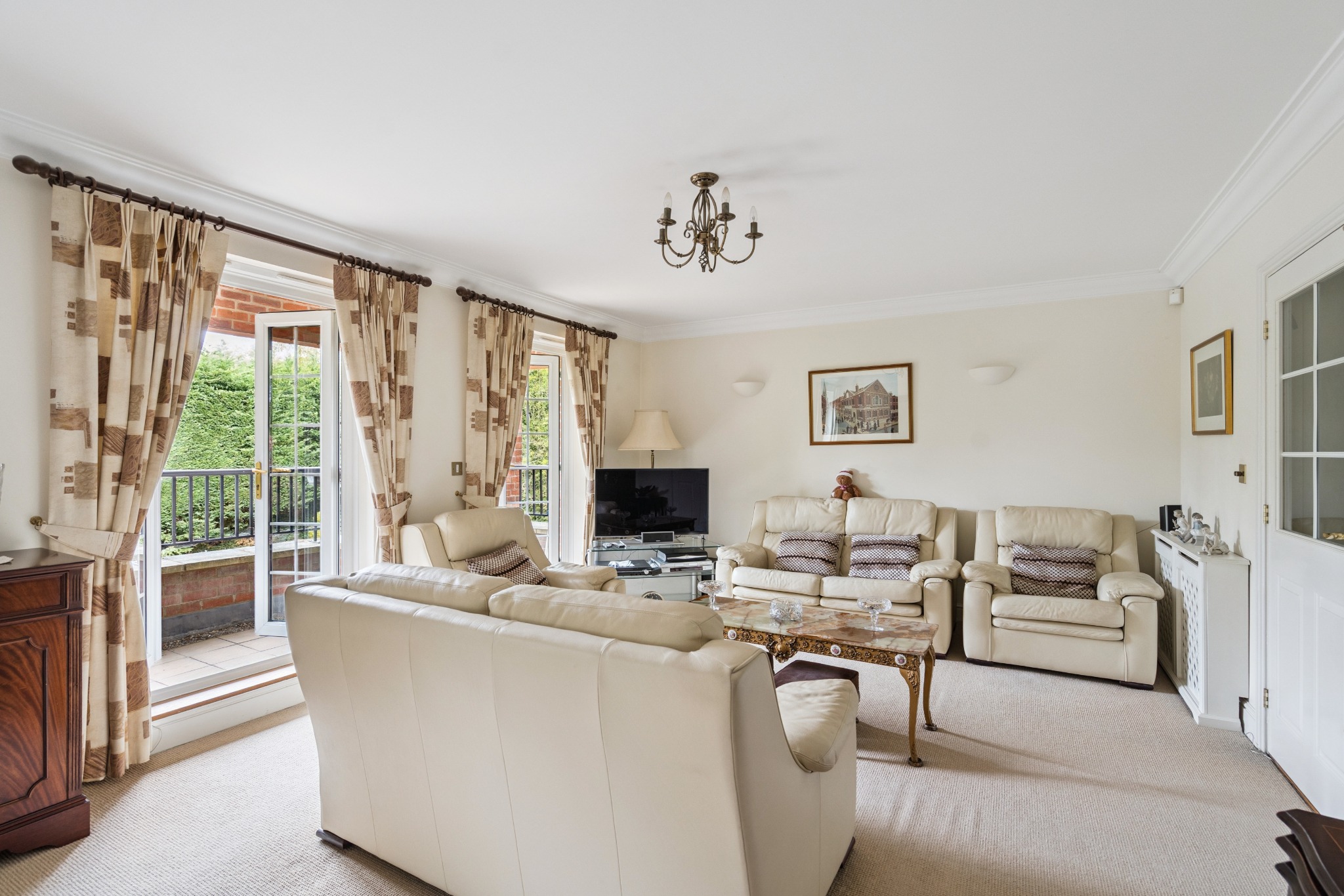 The apartment features a bright and generously sized living/dining room with double doors opening onto a private balcony, perfect for relaxing or entertaining. A separate, well-appointed fitted kitchen includes ample storage and space for dining.