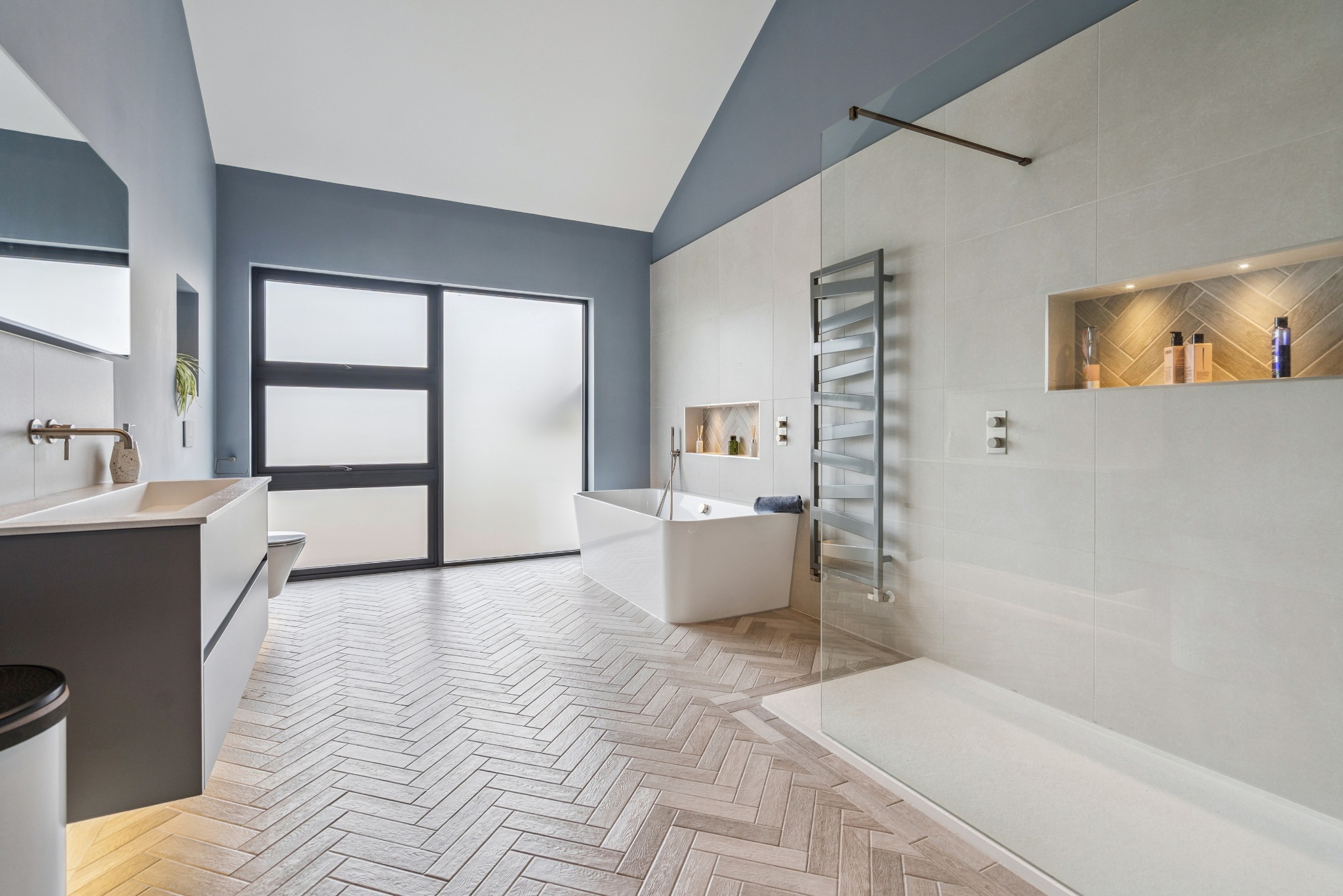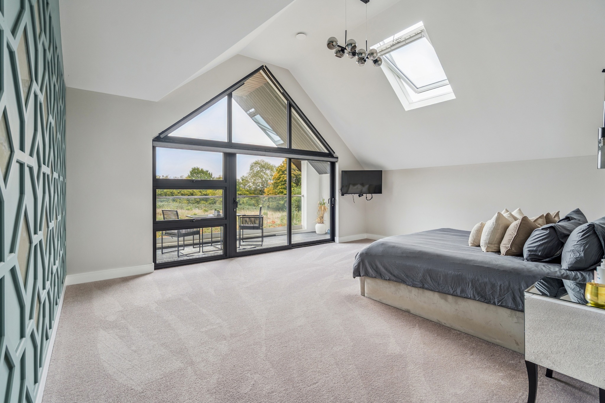 On the first floor, the luxurious principal suite boasts a dressing room, opulent en-suite bathroom with a roll-top bath, shower, and his-and-her basins, plus a private balcony overlooking picturesque farmland. Four further double bedrooms provide generous accommodation, with fitted wardrobes in three rooms, two en-suite bathrooms, and a spacious family bathroom, all featuring underfloor heating and sensor lighting for added comfort and convenience.
