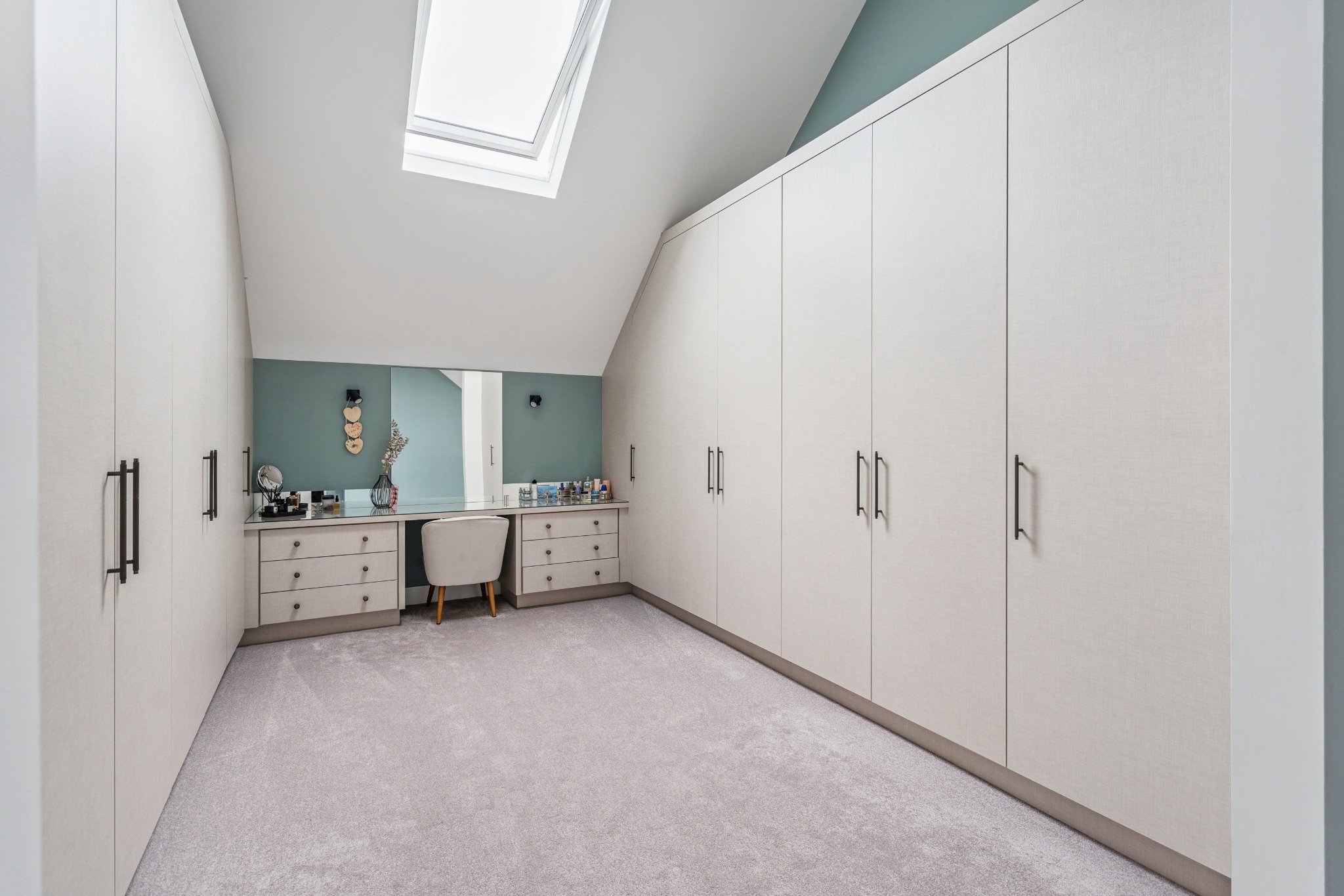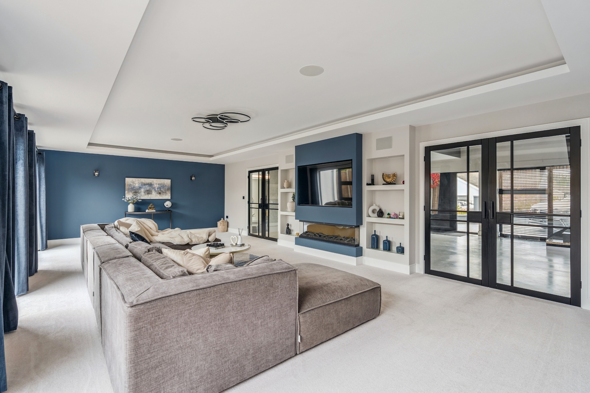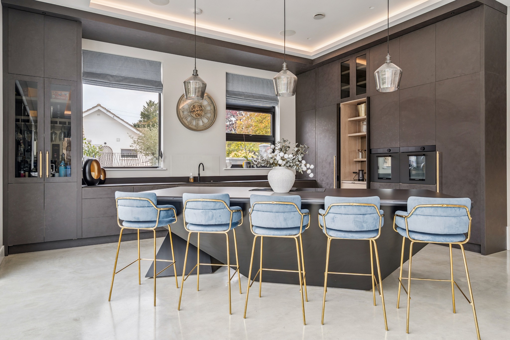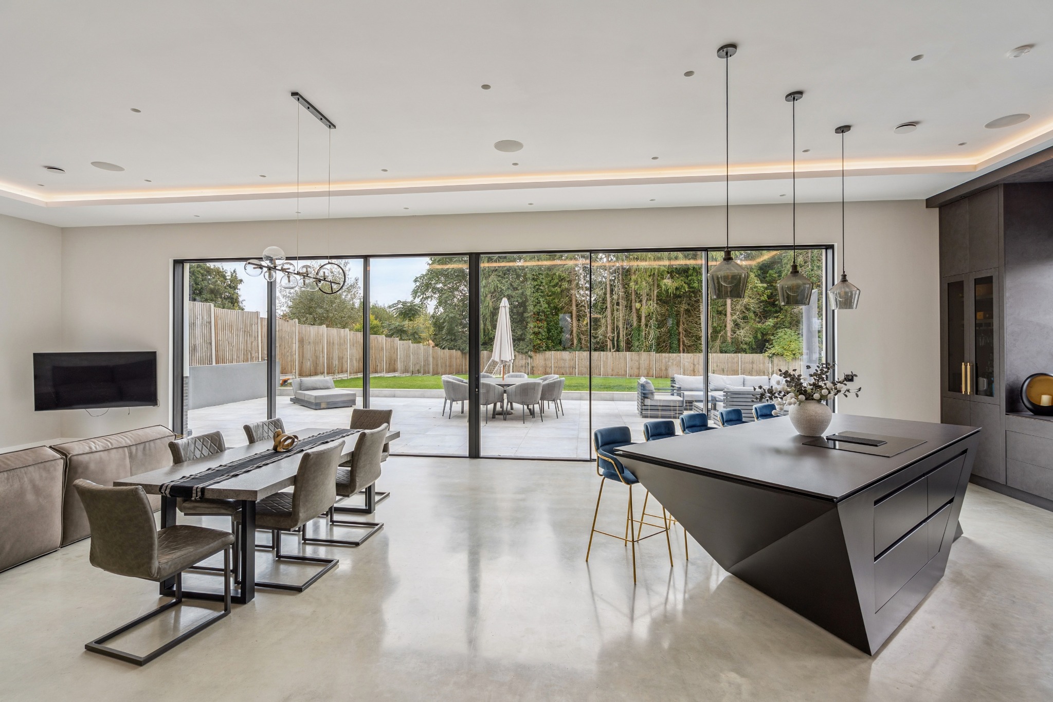 You are welcomed into a grand vaulted entrance hallway, complete with a guest WC and large cloakroom, setting an elegant tone for the home. From here, the heart of the property unfolds: a kitchen/dining/family room with full-width sliding doors that bring the outdoors in. The bespoke, hand-crafted kitchen is a masterpiece, featuring sleek fitted units, Dekton worktops, a double oven, wine fridge, and a substantial kitchen island with breakfast bar, perfect for family living and entertaining.