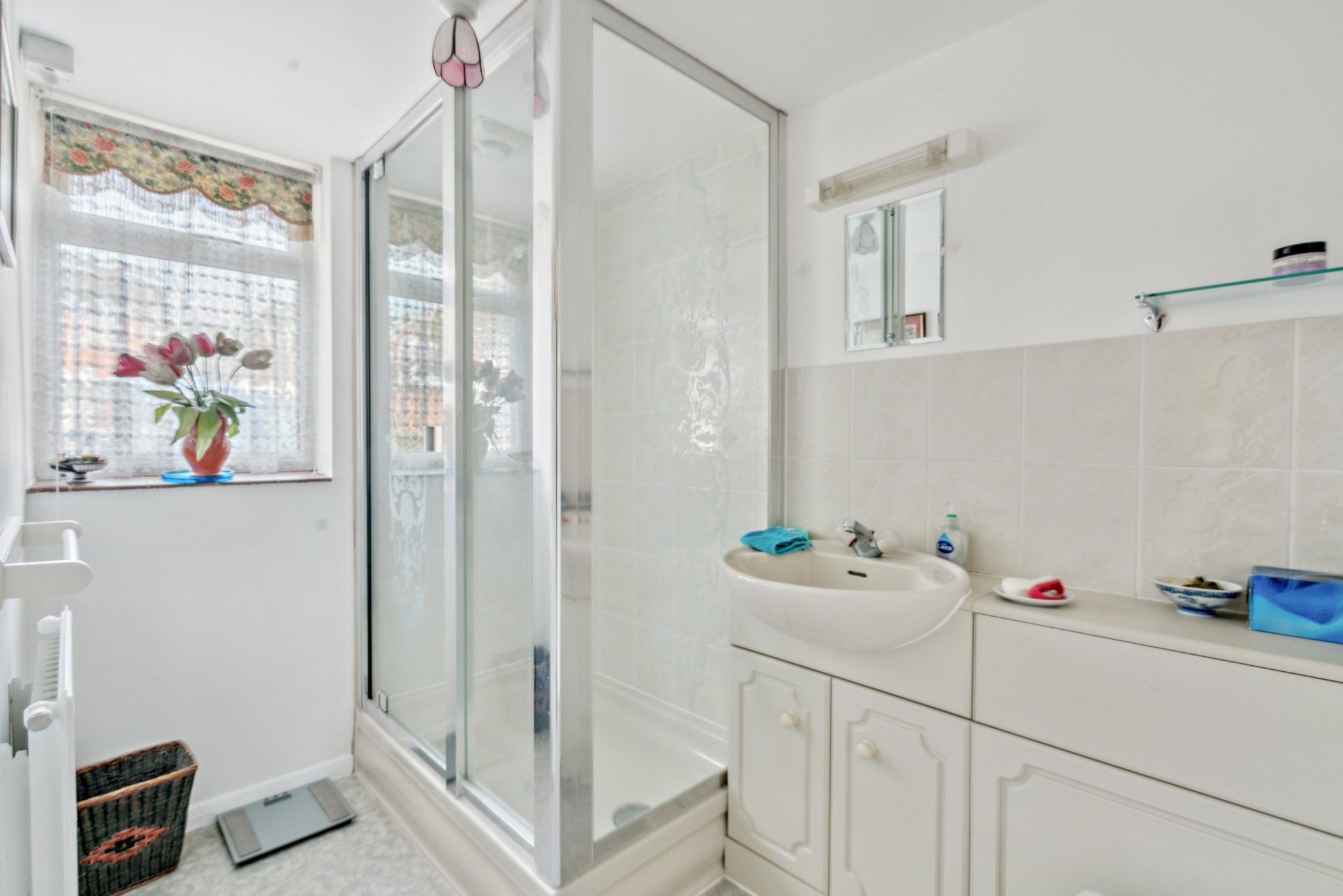 Upon entering, a spacious hallway leads to a ground-floor shower room, a generous, light-filled living room with a French door opening onto the south-facing garden. There is also a separate dining room and a well-equipped kitchen with fitted units. Adjacent to the kitchen, a utility room provides additional convenience with access to the garden and the integral garage.