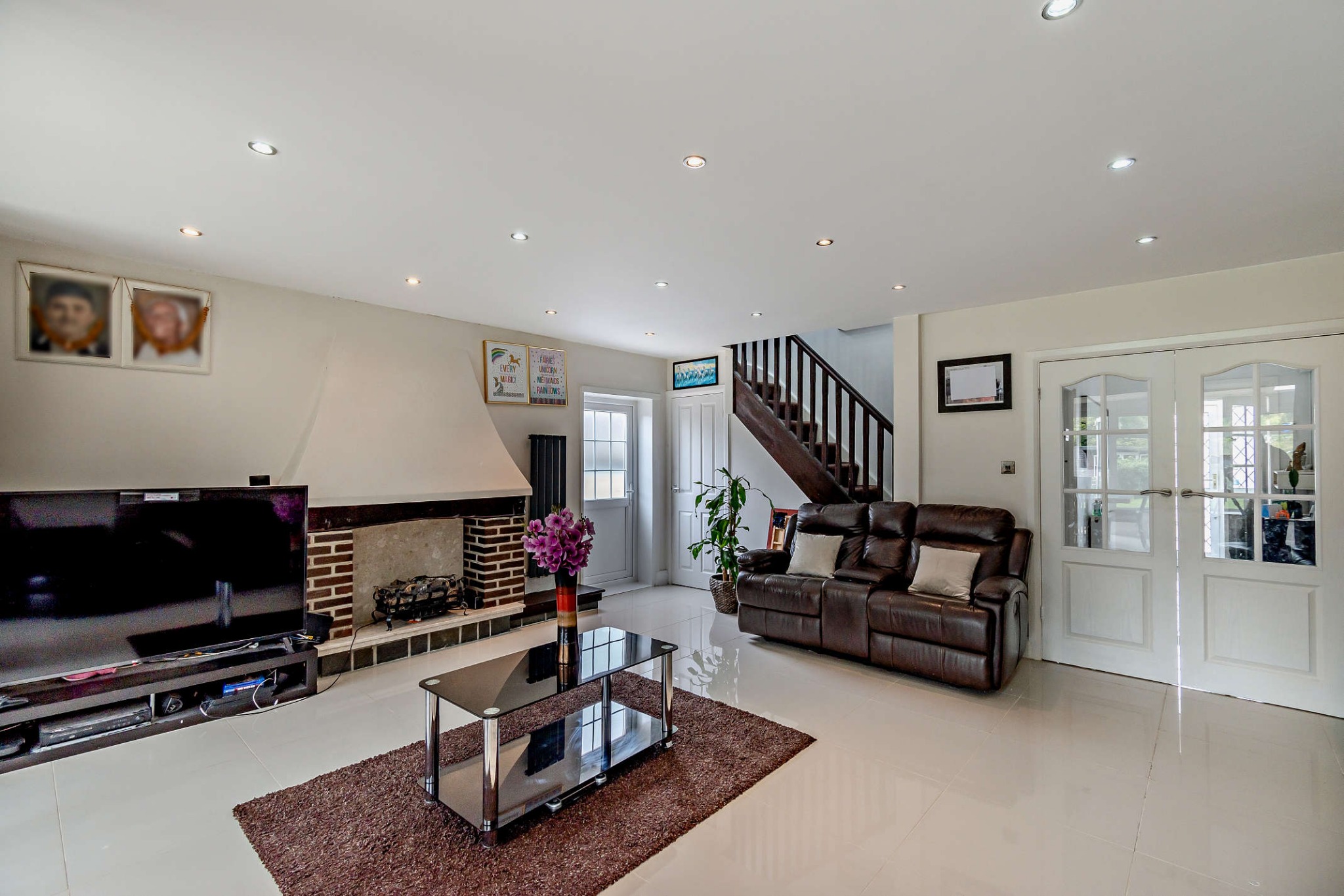 The ground floor comprises an entrance porch and hallway leading to two front aspect bedrooms with fitted wardrobes, a generous four-piece family bathroom, a large sitting room, and an open-plan kitchen / dining room. The kitchen features modern fitted units with integrated appliances and ample storage space, with a spacious, light-filled dining area overlooking the garden. There are two sets of adjoining doors from the sitting room to the dining area allowing you to open up the rooms if preferred. The property also benefits from a utility room.