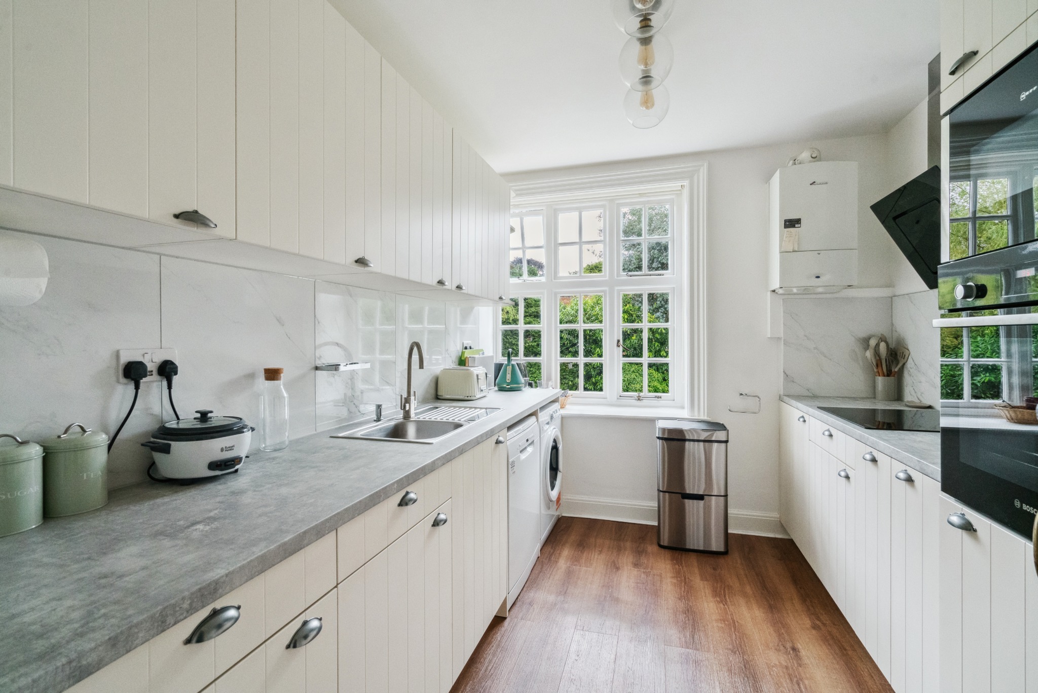 The apartment comprises a spacious entrance hallway, two large double bedrooms, a generous reception room, a family bathroom and a kitchen with integrated appliances. The apartment comes with a share of freehold, a garage in a nearby block and has recently been renovated throughout, with a brand-new kitchen and bathroom.