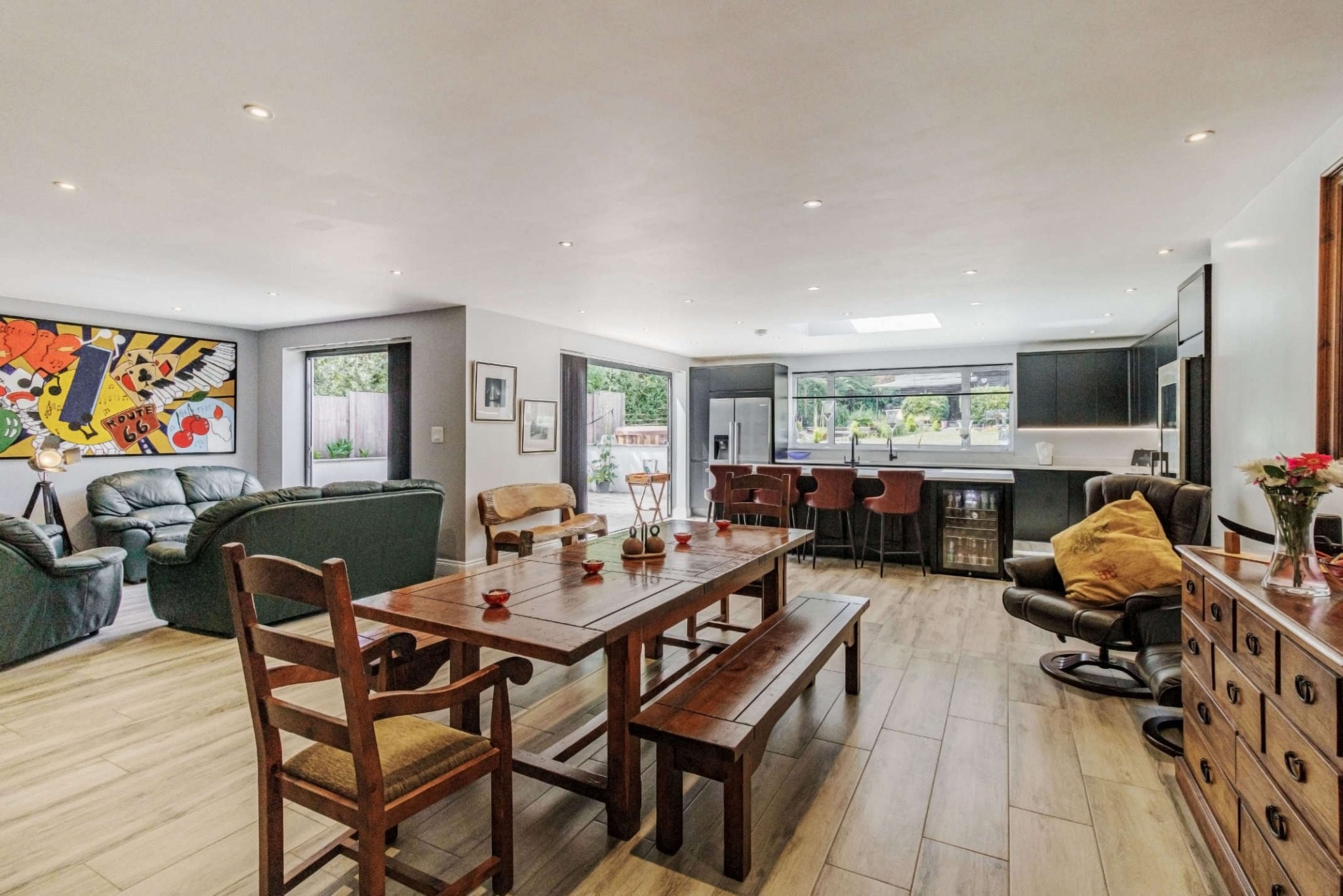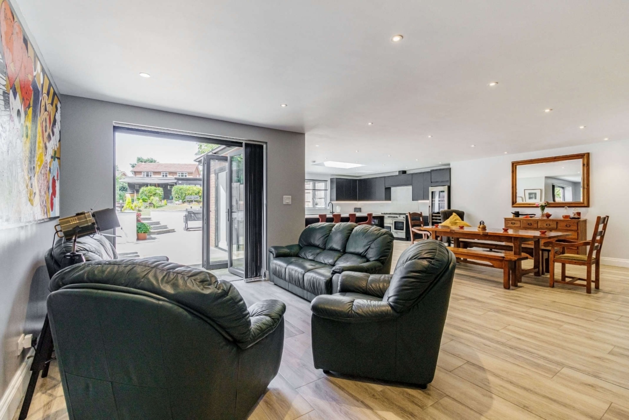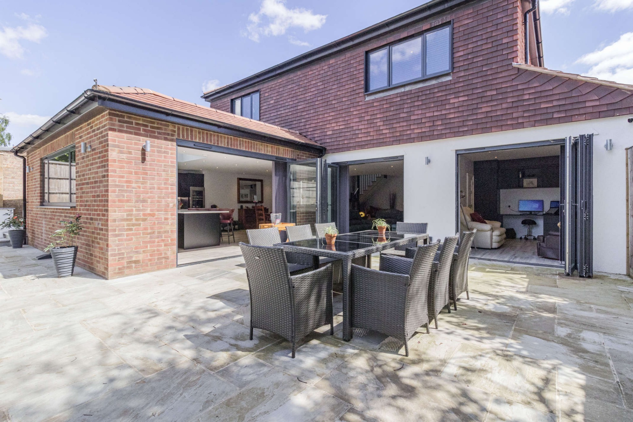 The property comprises a stunning open plan Kitchen/Living/Dining room, with two sets of bi-fold doors opening to the patio. The modern kitchen has integrated appliances, under cupboard lighting and an extensive island/breakfast bar. There is also a family room, utility, study/bedroom five and a ground floor shower room.