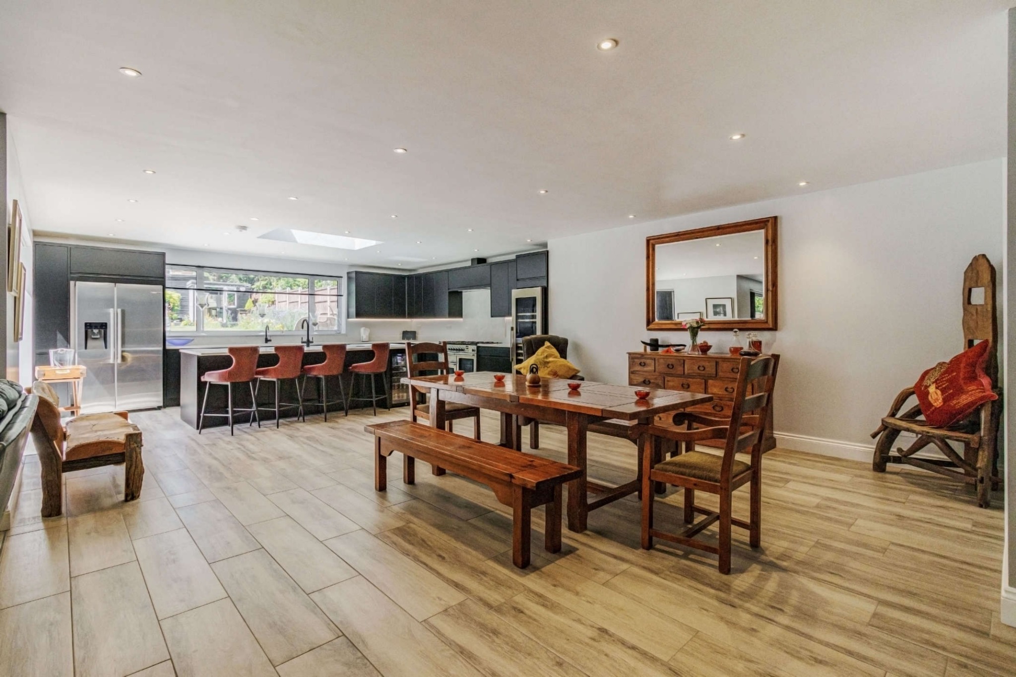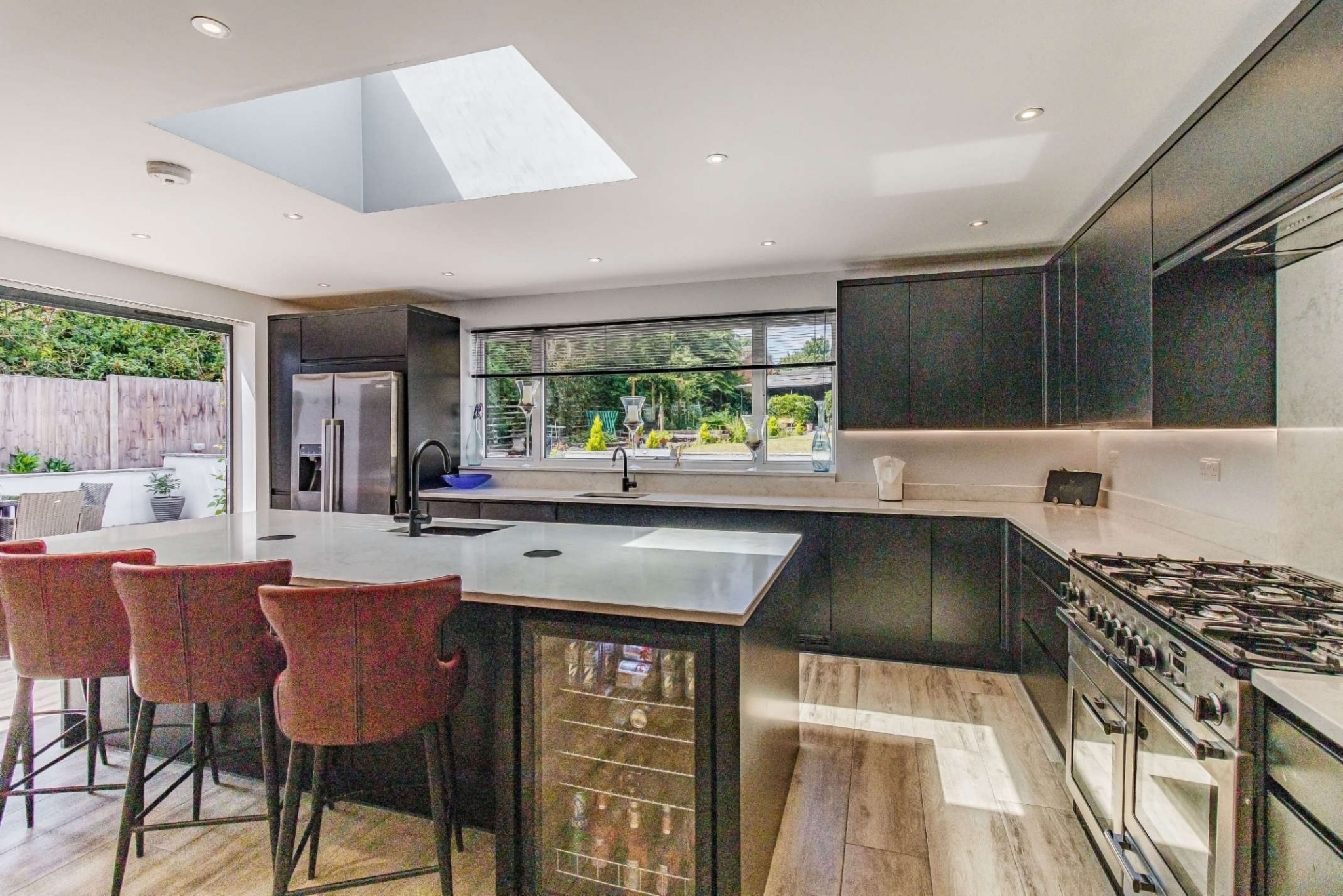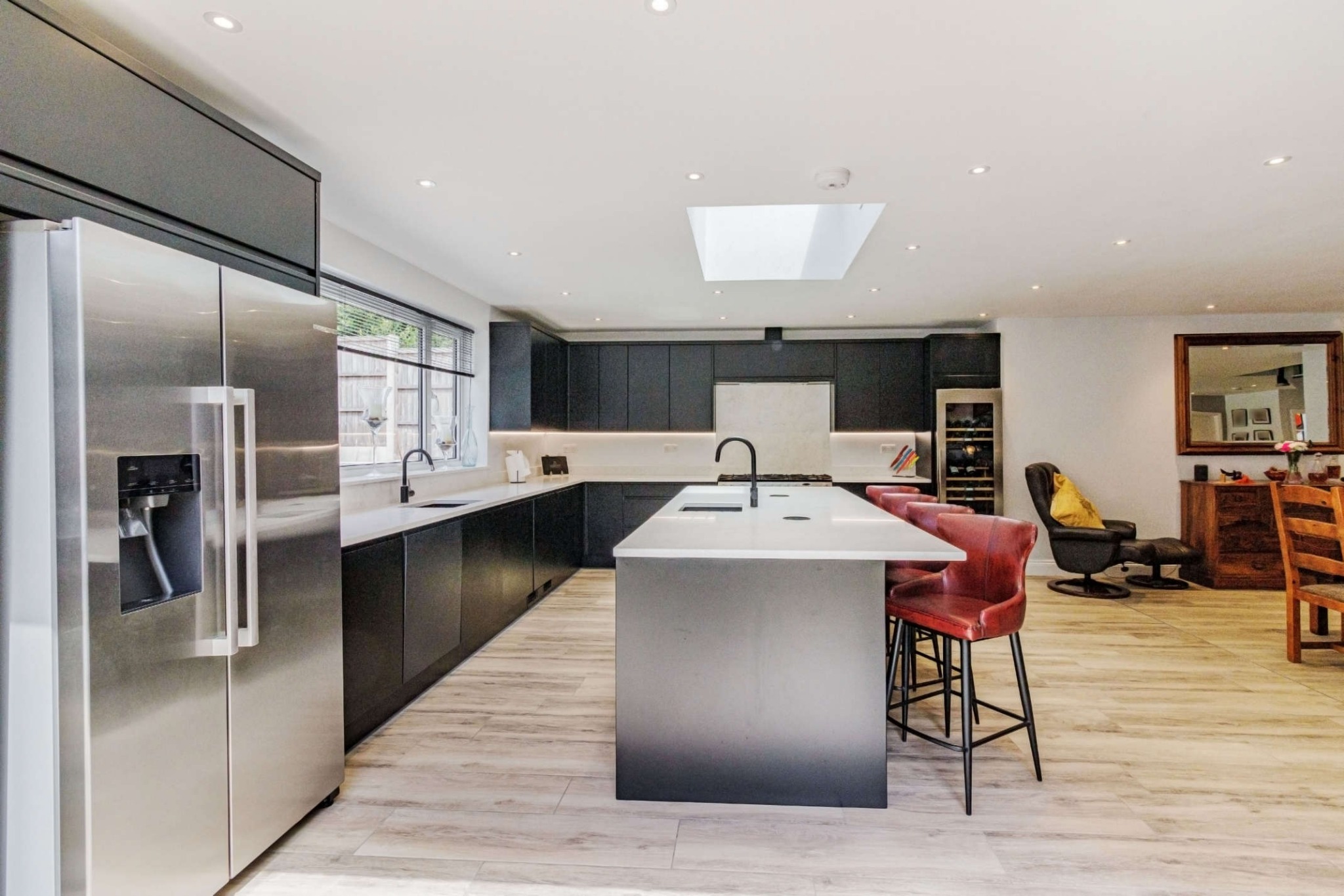The property comprises a stunning open plan Kitchen/Living/Dining room, with two sets of bi-fold doors opening to the patio. The modern kitchen has integrated appliances, under cupboard lighting and an extensive island/breakfast bar. There is also a family room, utility, study/bedroom five and a ground floor shower room.