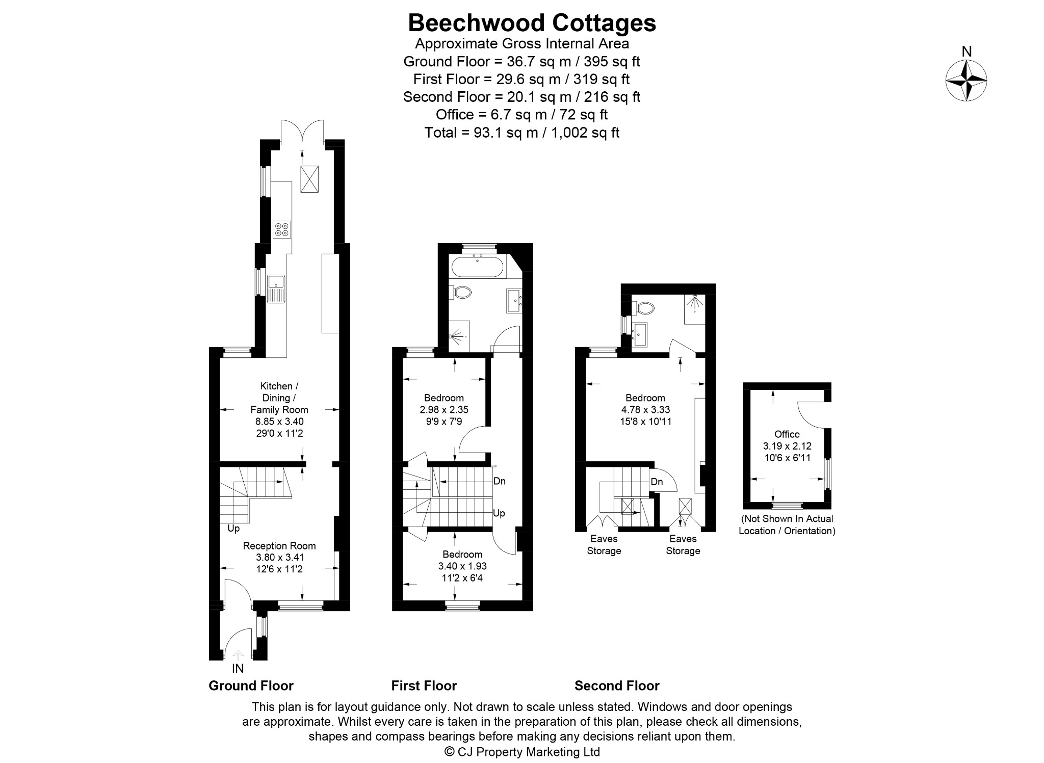 The ground floor comprises an entrance porch, a front aspect reception room, and an open-plan kitchen / living area with access to the garden. The kitchen features modern, neutral units providing plenty of storage, with a large skylight and the patio doors flooding the space with natural light. Two good-sized bedrooms with storage are located on the first floor, along with a luxury four-piece family bathroom. The second floor hosts the master bedroom, complete with an en-suite shower room and eaves storage.