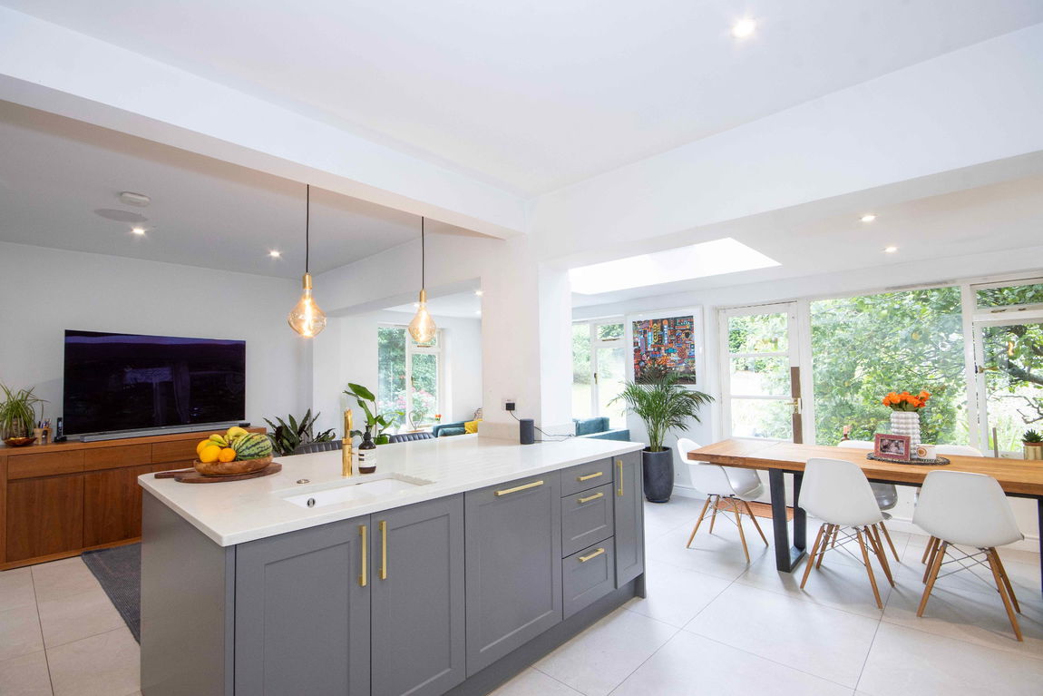 The heart of the home is the stunning open-plan kitchen/dining/breakfast room, bathed in natural light from two skylights and a French door leading to the garden. The contemporary kitchen is fitted with ample storage and high-quality integrated appliances, including a double oven, microwave, wine cooler, and a large central island/breakfast bar, perfect for family living and casual dining.