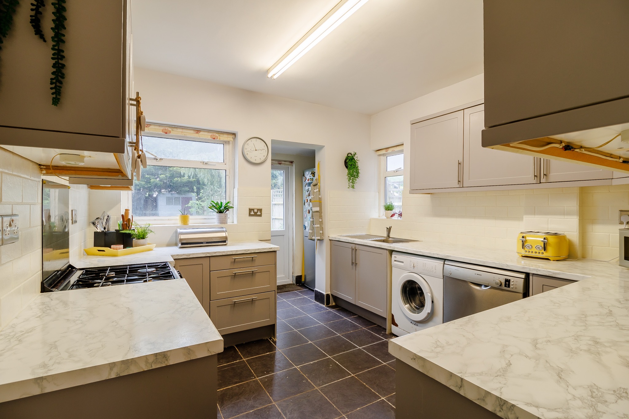 There is a modern fitted kitchen with ample units and work surfaces, together with a gas hob, space for appliances and access to the rear garden.
