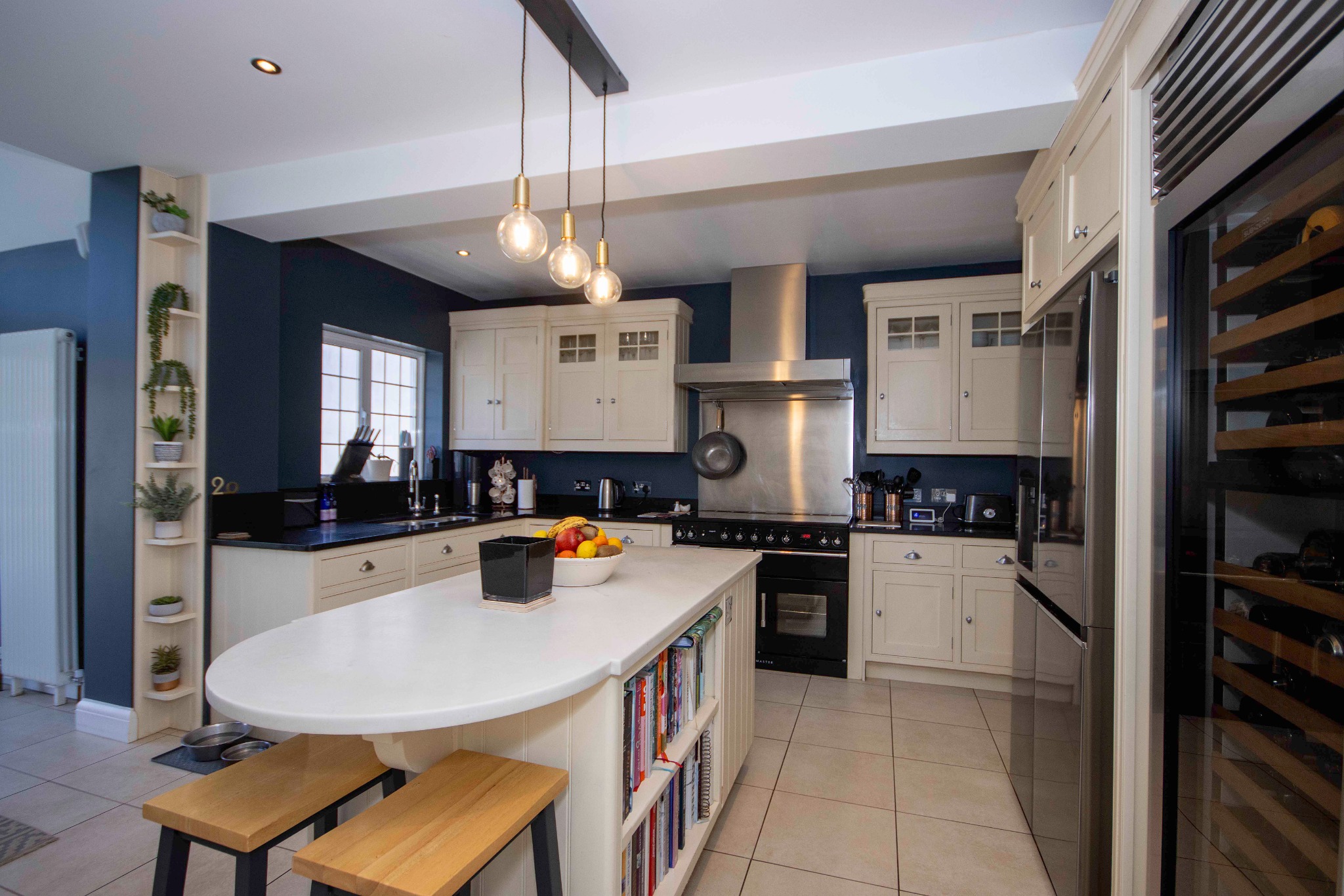 The heart of the home is the stunning kitchen/dining room, flooded with natural light and ideal for family living or entertaining. It boasts a wide range of fitted units, integrated appliances including a large wine fridge, and a stylish kitchen island/breakfast bar providing additional worktop space and storage. French doors lead directly from the kitchen to the rear garden, creating seamless indoor-outdoor living. Just off the kitchen is a utility room with further storage and access to the garden.