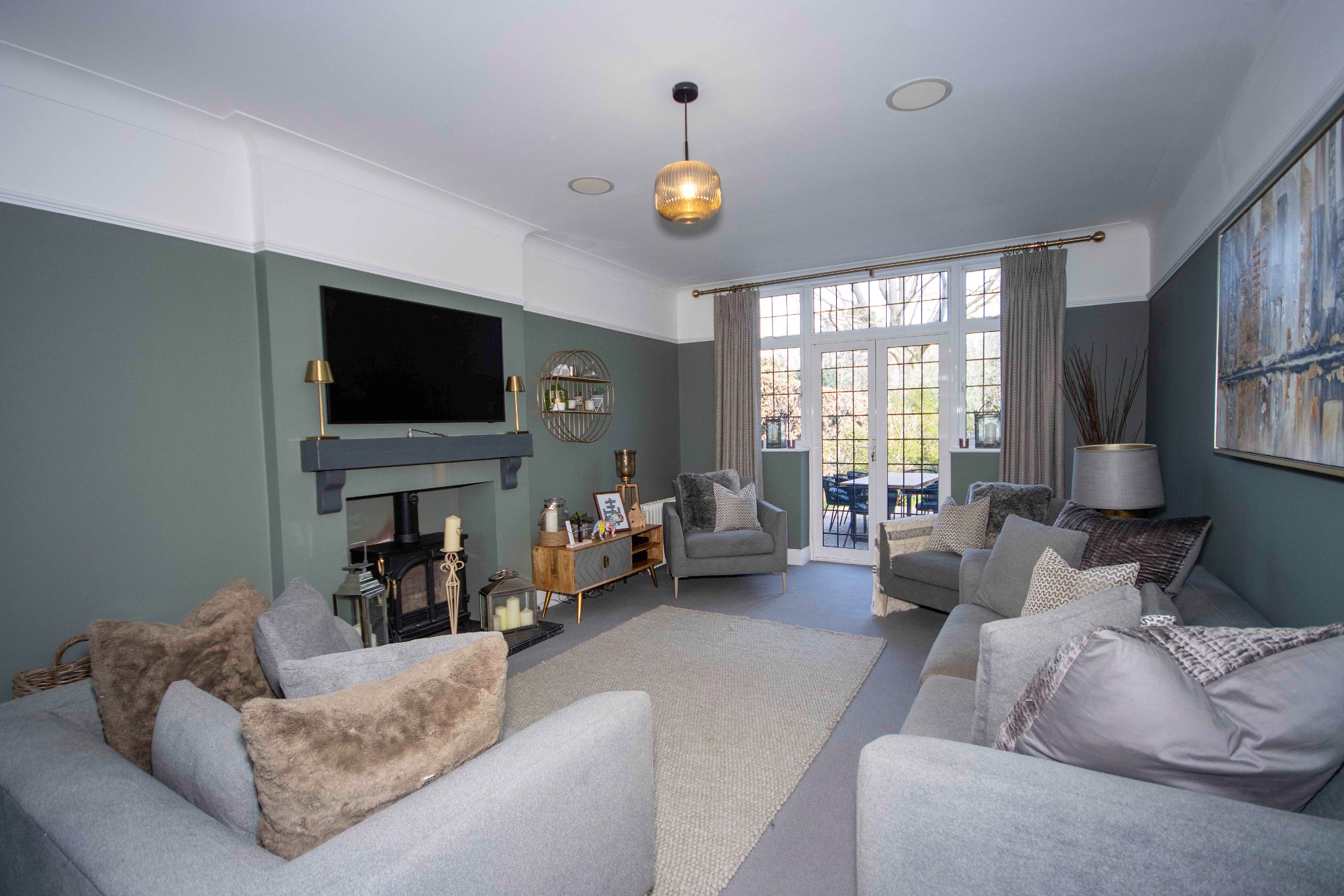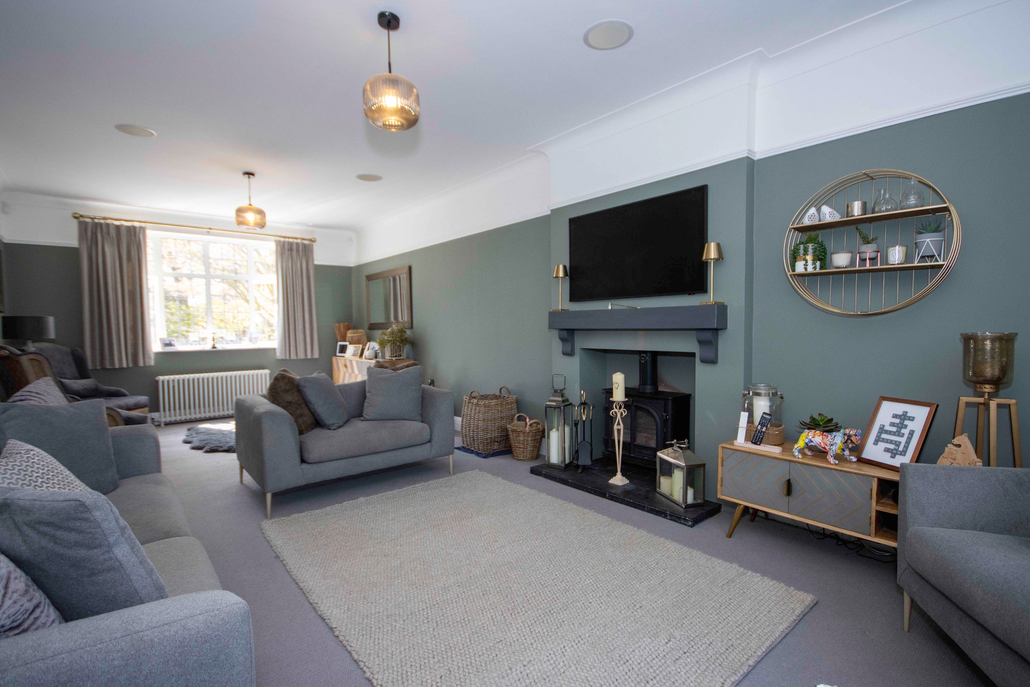 As you enter the property, you are welcomed by a spacious hallway leading to a double-aspect reception room with a striking feature fireplace and French doors that open out onto the rear garden. A second reception room benefits from a large bay window offering picturesque views of the immaculate garden.