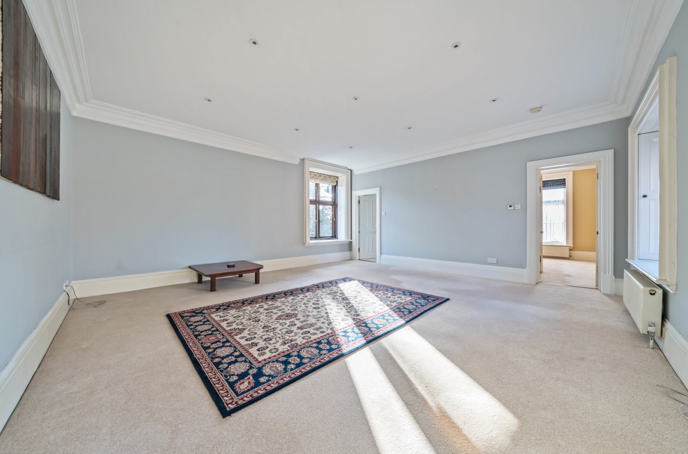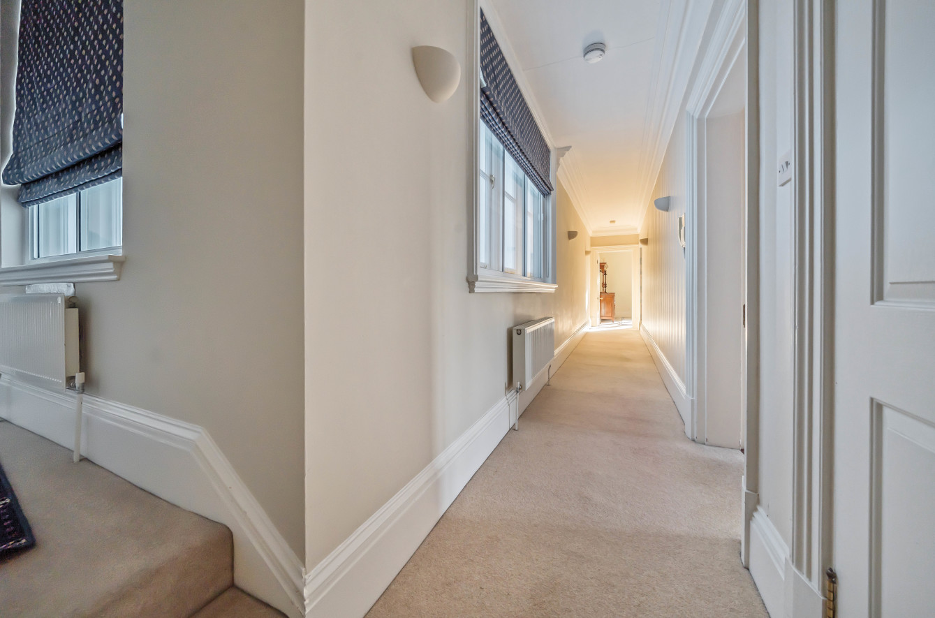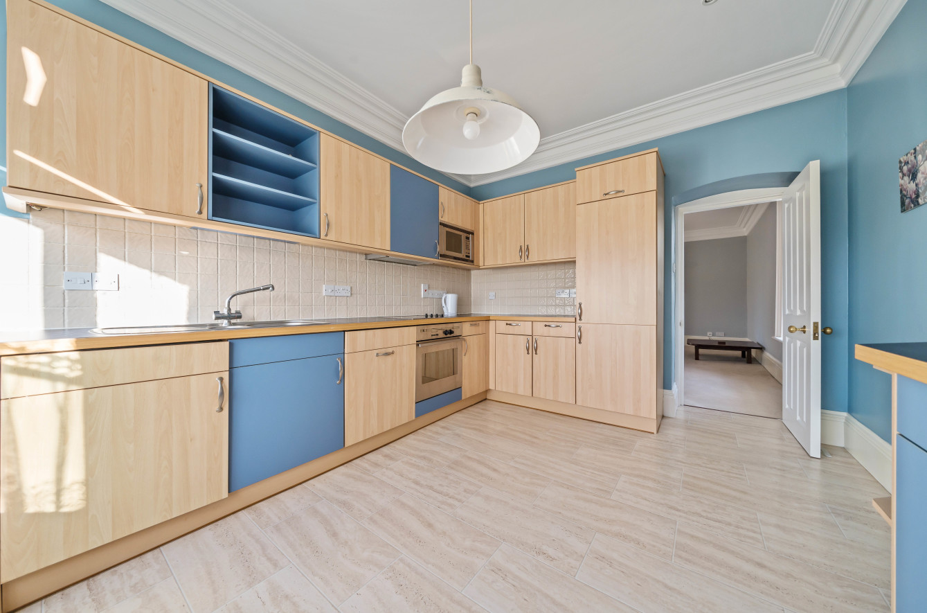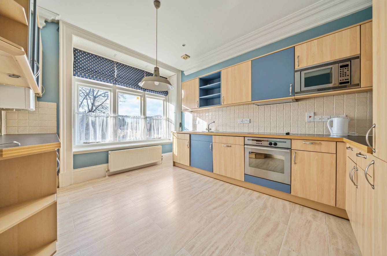 Upon entering the property, you are greeted by a grand entrance hall with stairs to the first floor. The apartment comprises an entrance hallway with a useful cloak cupboard. There is a spacious reception room with three windows that allow the room to be flooded with light. Off the reception room is a third bedroom and a kitchen with a variety of fitted units, integrated appliances and space for a small dining table and chairs.