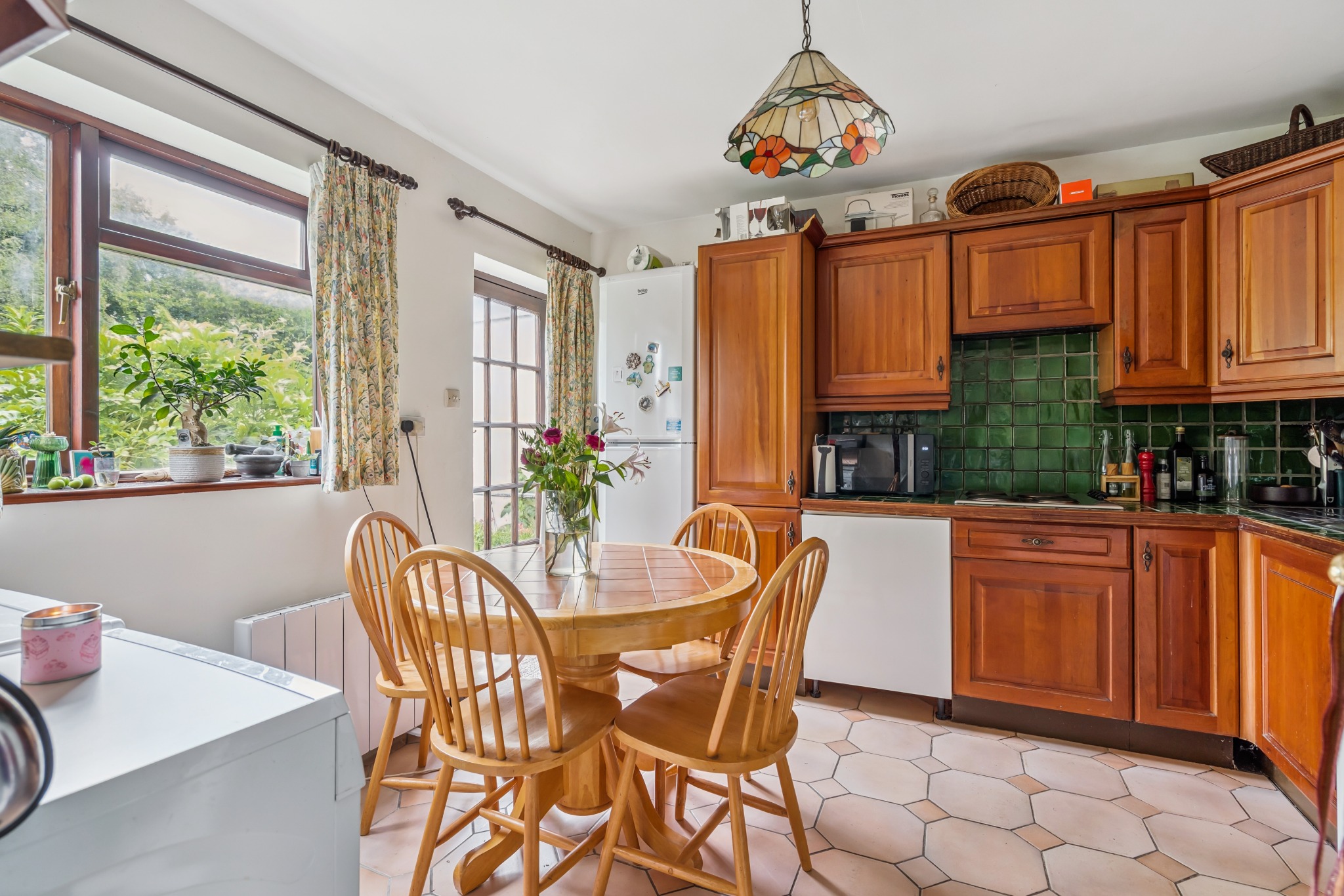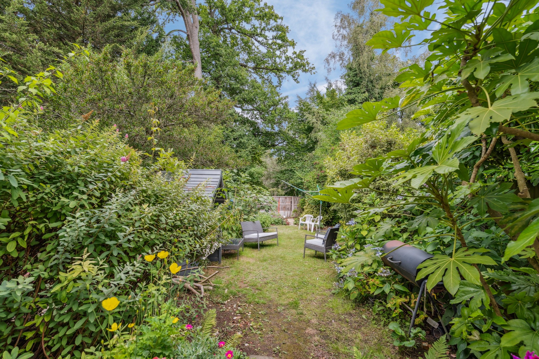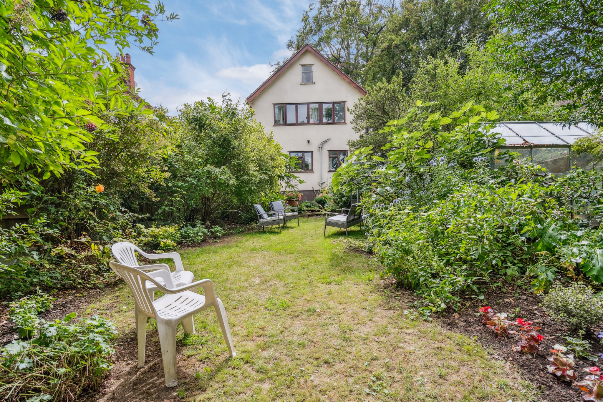 Outside, the beautiful rear garden is a private oasis, laid to lawn and surrounded by mature trees, shrubs, and colourful flowerbeds. The front of the property includes a garden, off-street driveway parking, and convenient side access to the rear.