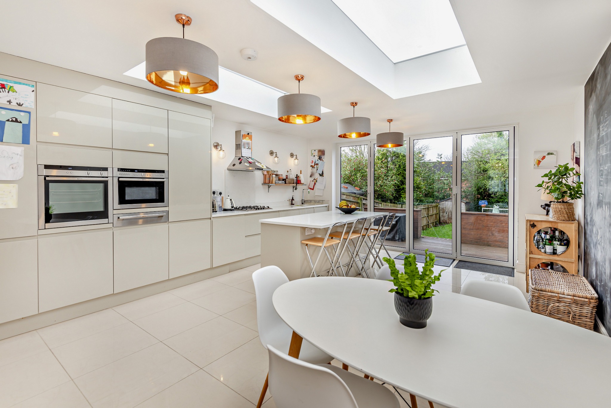 An immaculately presented, four-bedroom, two-bathroom extended family home offering both stylish and modern interiors throughout, situated within easy reach of local amenities, schools and excellent transport links. The ground floor comprises a hallway with stairs to the first floor and under stairs' storage cupboard. There is a generous, open plan, light-filled reception room/dining room with two feature fireplaces that flows effortlessly into a beautiful kitchen/breakfast room. The kitchen/breakfast room has been designed to create the ideal entertaining space, offering a range of modern, white handless units, integrated appliances, a breakfast bar with additional worktop space and bi-folding doors opening out to the garden. Completing the ground floor is a guest WC.
