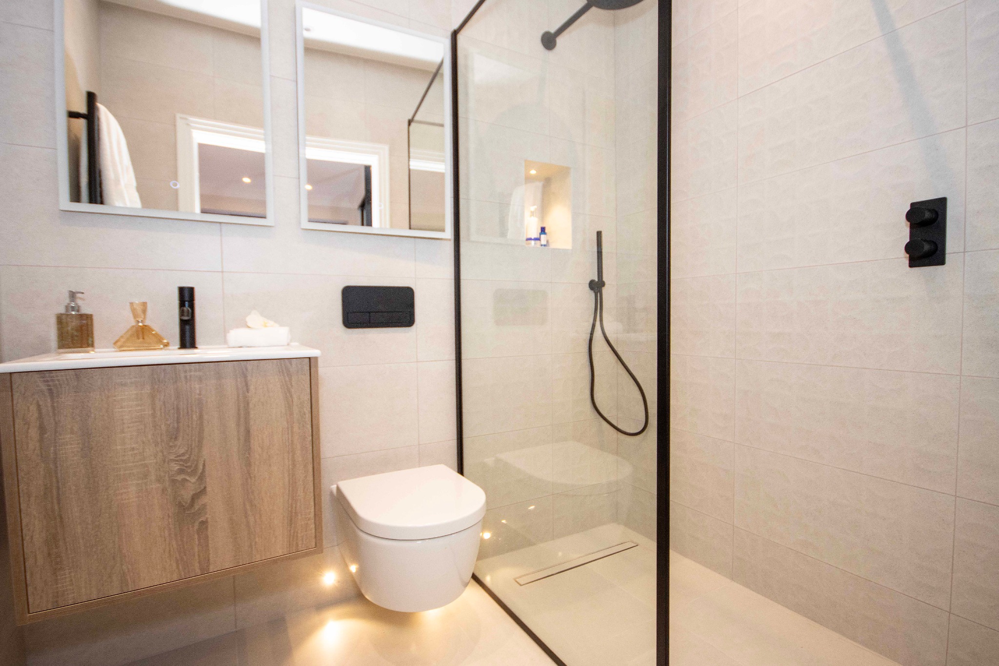- Wet Underfloor heating through all areas controlled by Thermostat and via phone app