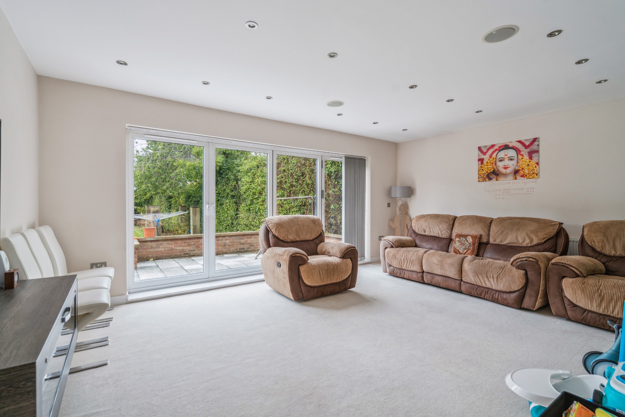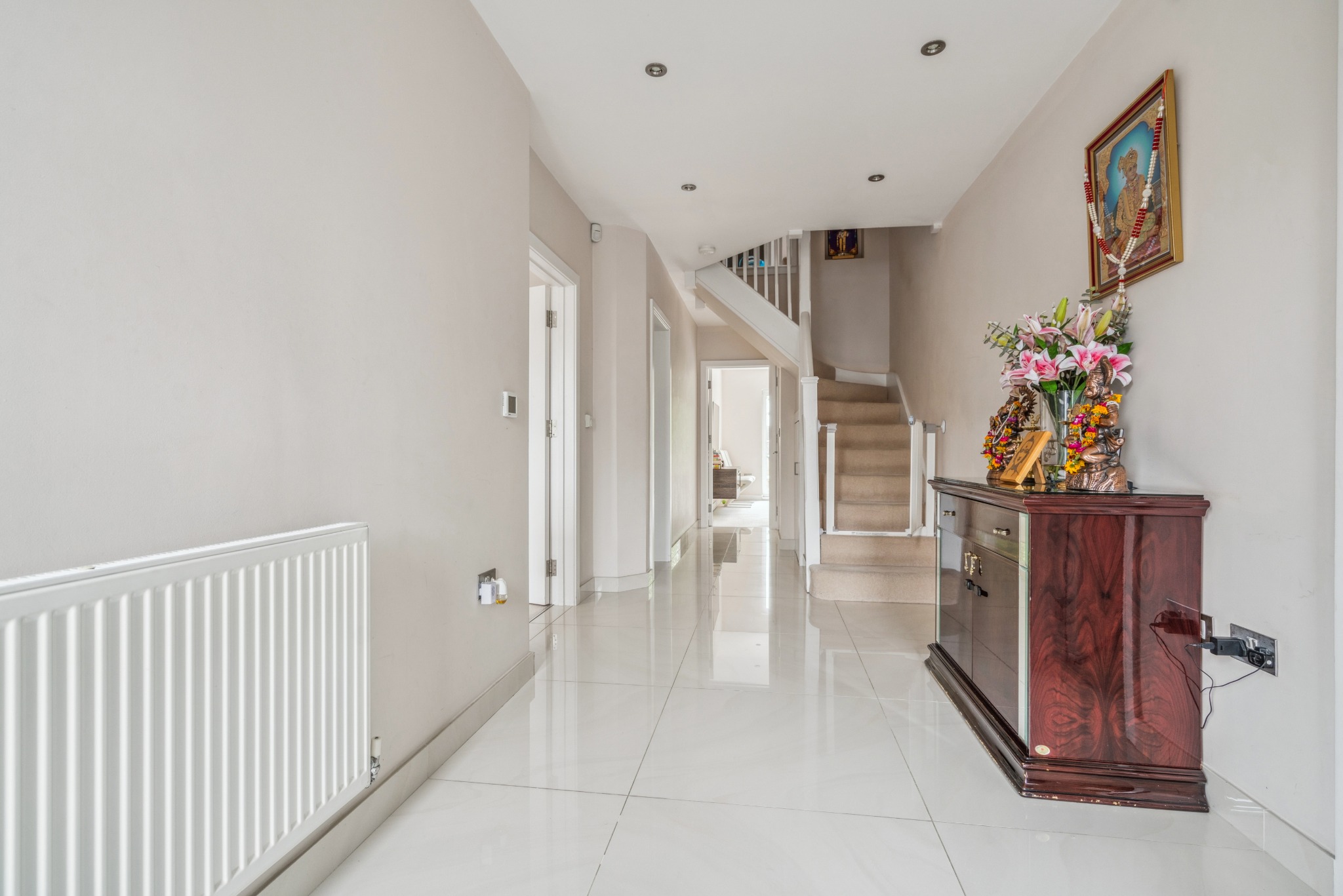 An impressive seven bedroom, five bathroom detached residence ideally positioned on a quiet residential street in the heart of the Eastbury Farm Estate. This substantial family home has been thoughtfully extended and remodelled, offering over 4,000 sqft of accommodation on three well-appointed levels.The ground floor comprises a welcoming entrance hall with porcelain tiled floors and a guest cloakroom, three generous reception rooms, an open-plan kitchen/diner and a separate utility room/spice kitchen. The stylish kitchen diner is fitted with a range of high-gloss cabinets with integrated appliances and boasts a large central island.