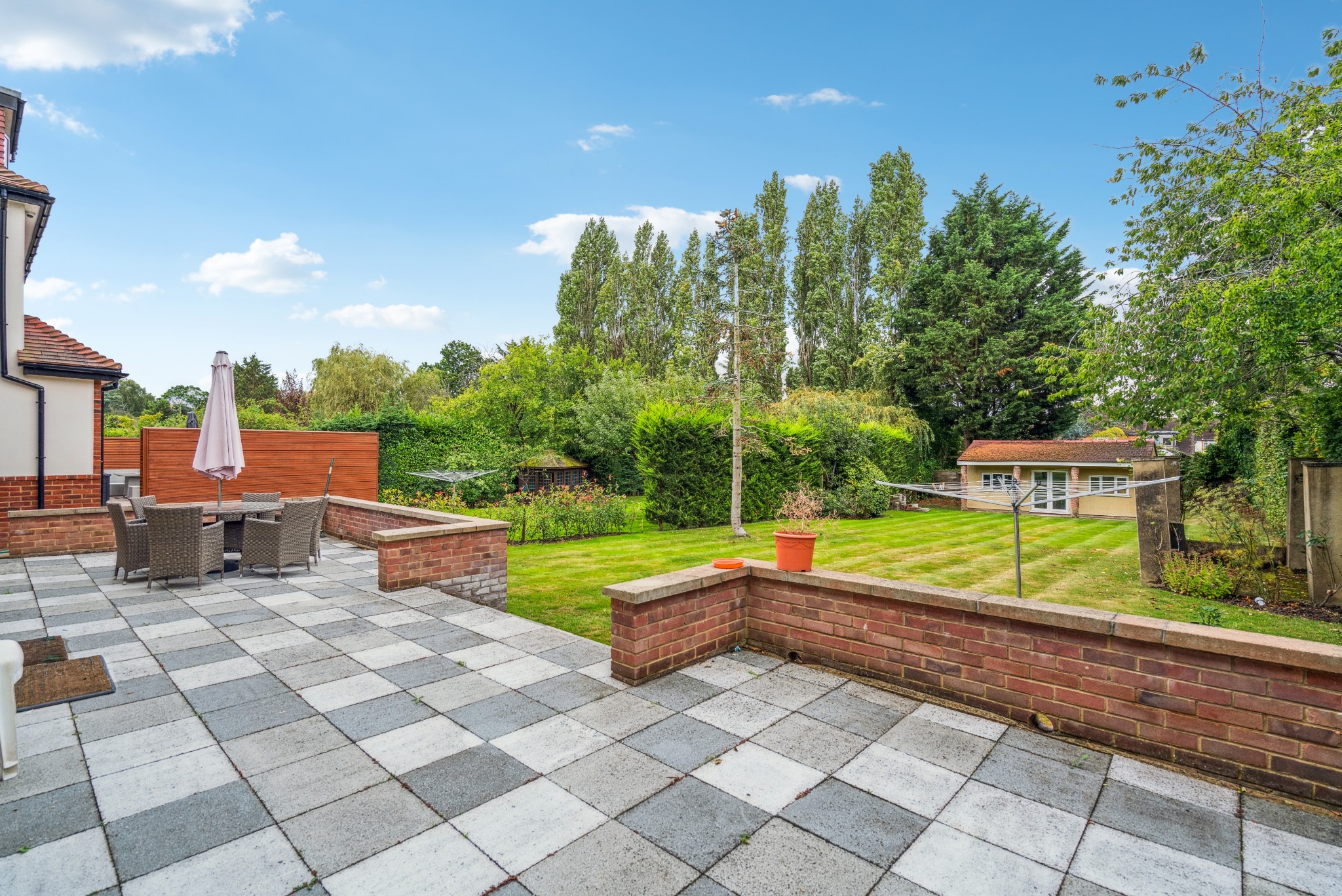 A south-westerly facing rear garden extends to approximately 130 feet in length, with a raised paved patio area overlooking the expansive lawn and a detached outbuilding which could be turned into a home office / gym.
