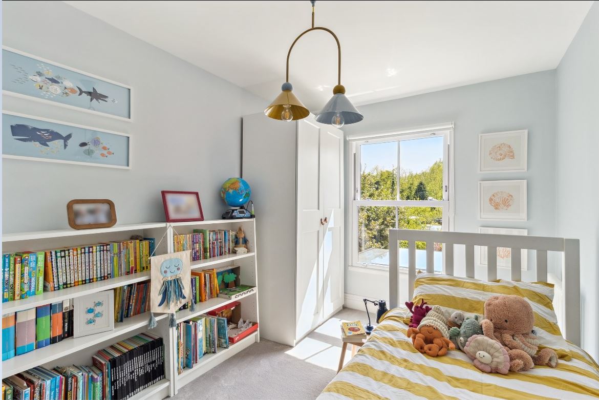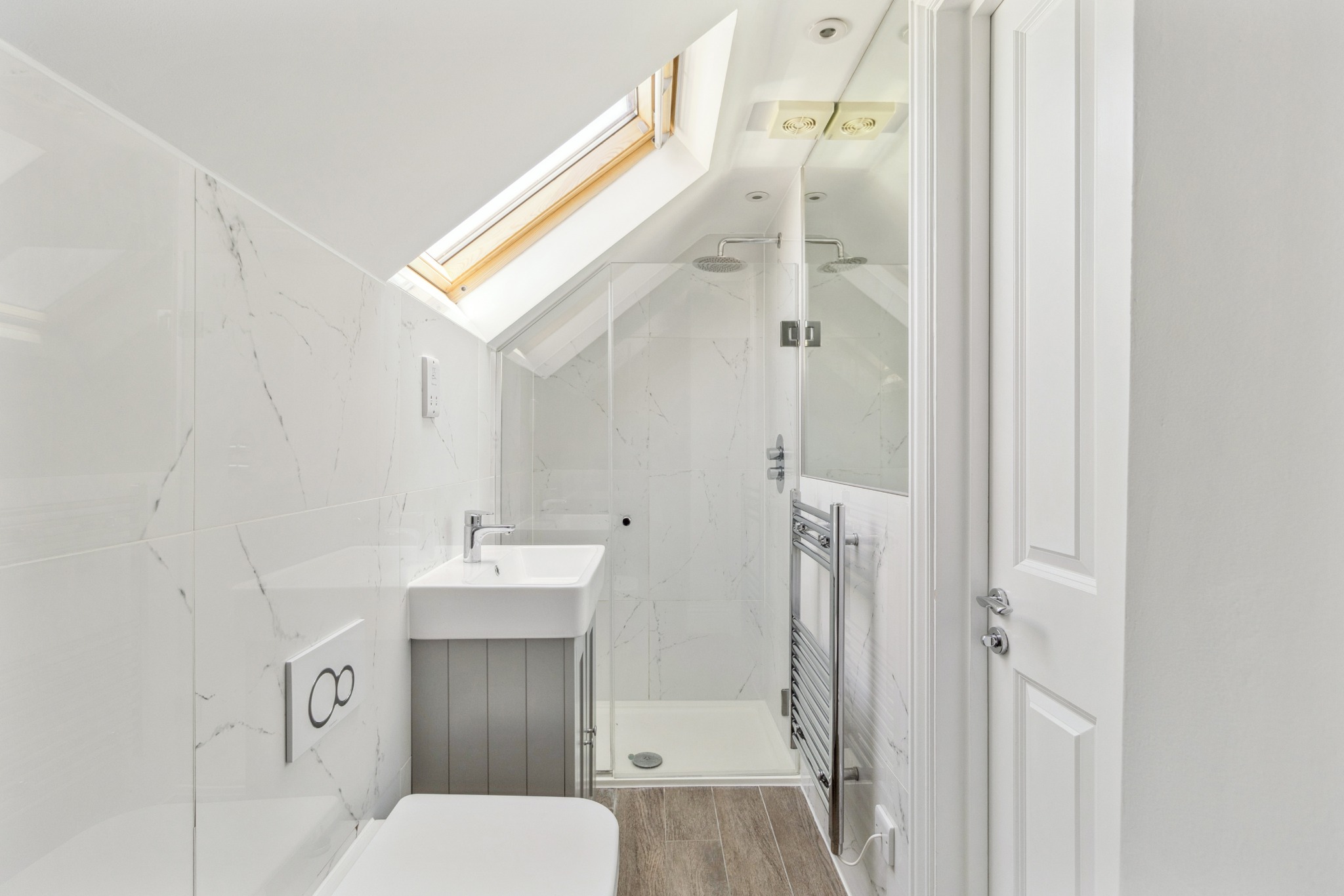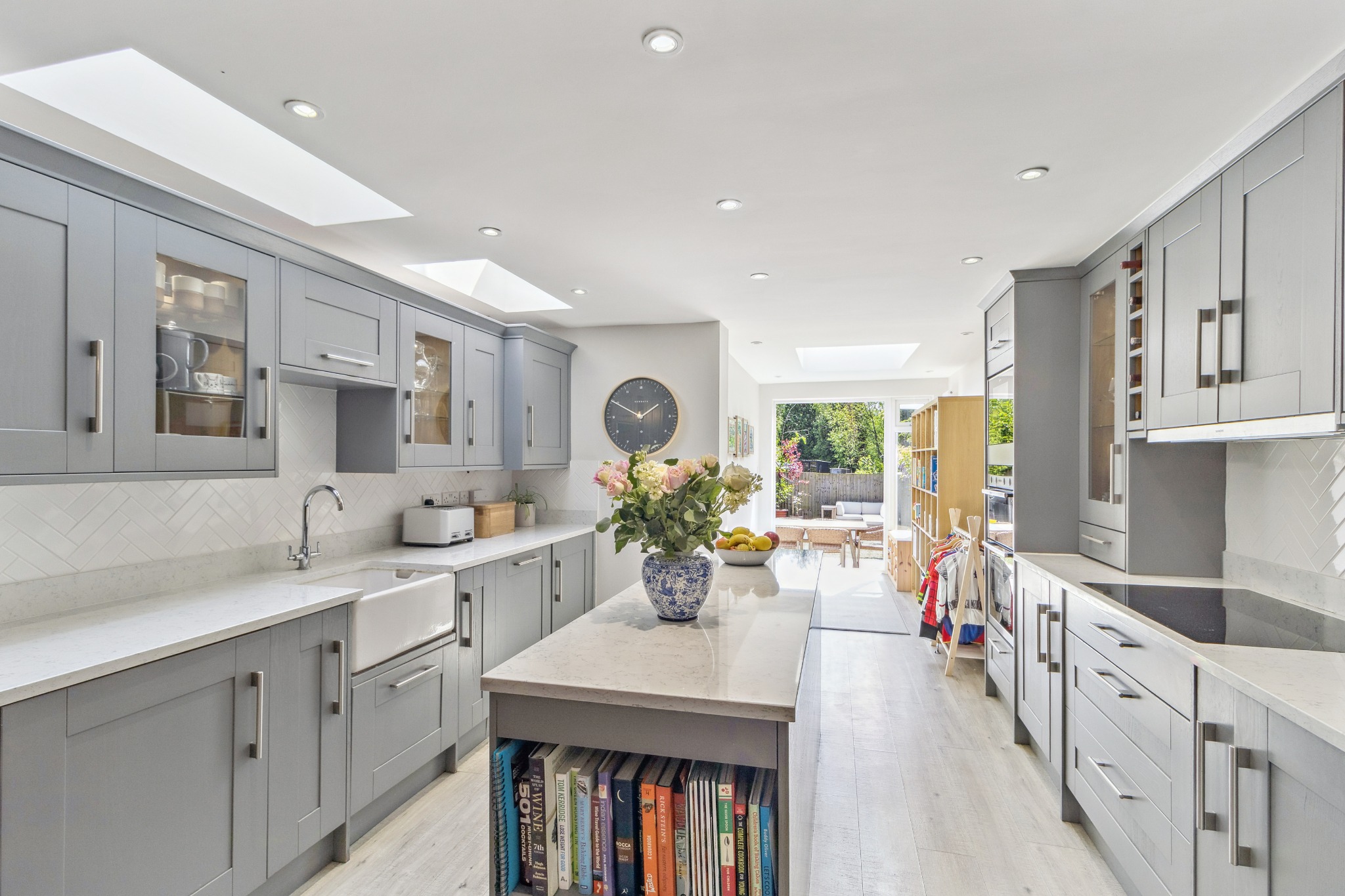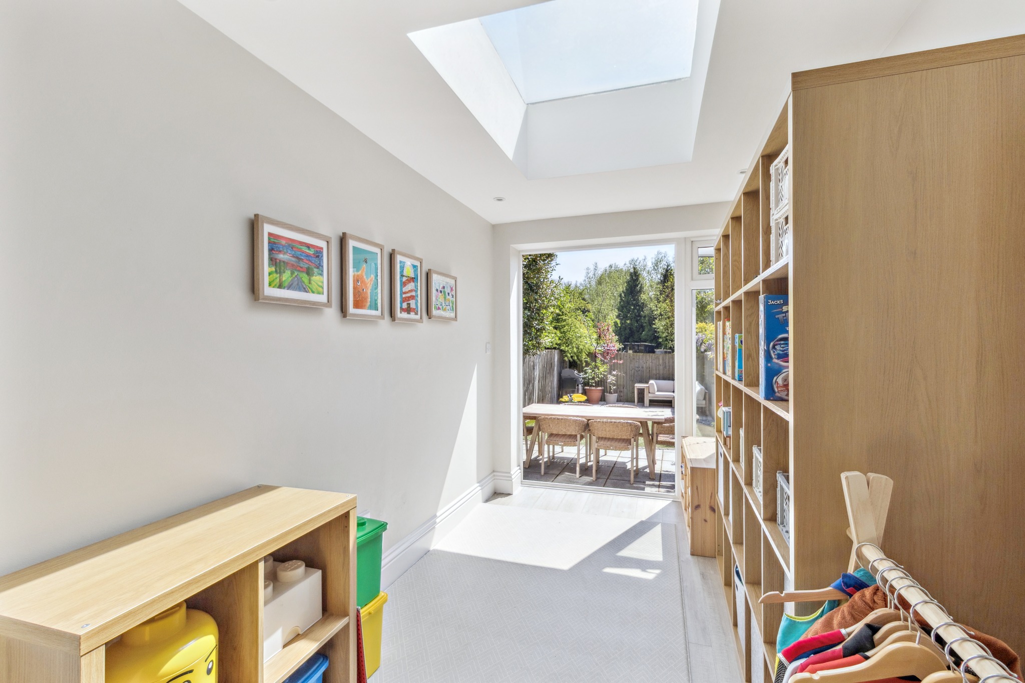 This home welcomes you with a deep hallway leading to a front-aspect lounge featuring two windows that flood the space with natural light. A dining room seamlessly connects to a sleek, modern kitchen, which boasts an array of fitted units, integrated appliances, and a central island. The kitchen and sitting/playroom are enhanced by three skylights and French doors that open out to a beautifully landscaped garden. Completing the ground floor is a guest WC.