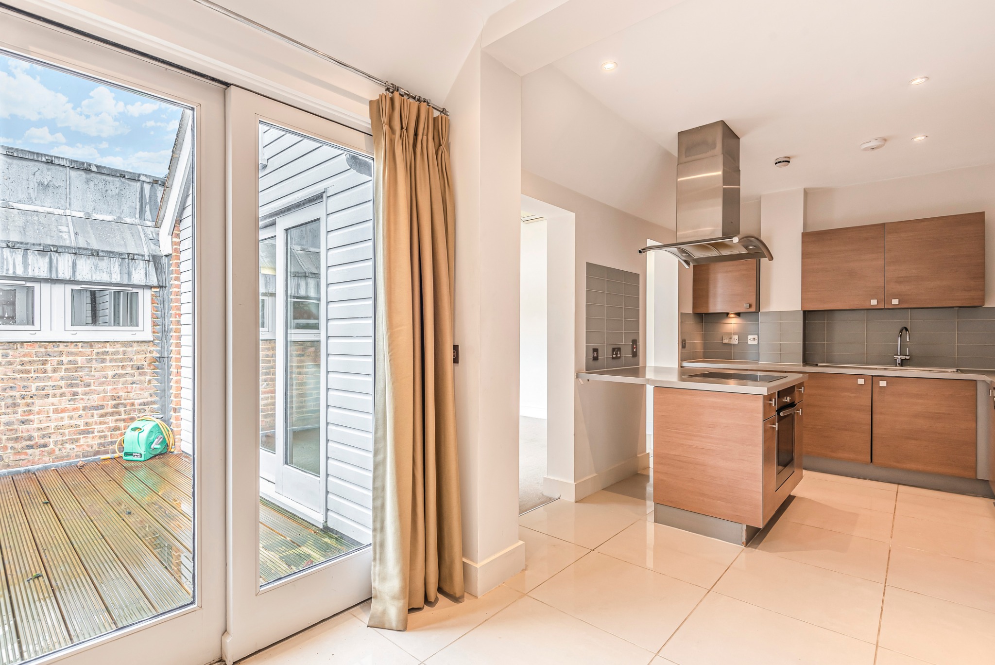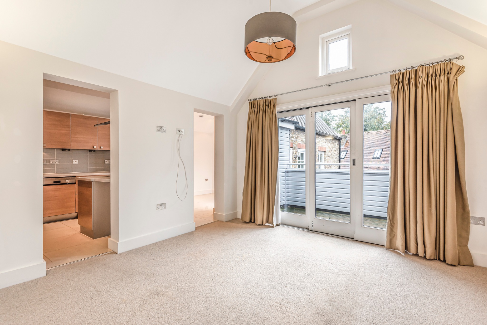 Accessed via a private front door with stairs leading to the apartment, you are welcomed into a spacious hallway that flows into a bright and airy living room. Double doors open out to a private balcony, perfect for enjoying your morning coffee or relaxing in the evening. Adjacent to the living area is a well-equipped kitchen featuring a range of modern fitted units, integrated appliances, and ample worktop space, ideal for both everyday use and entertaining.