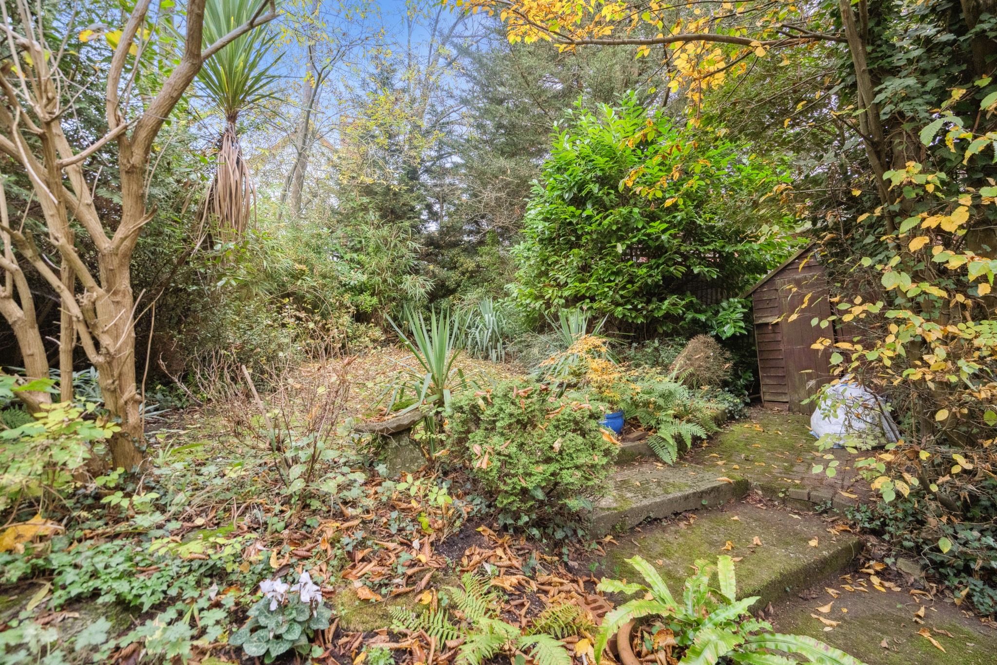 Externally, the property features a large, landscaped rear garden with a variety of shrubs and flowers. There is also a garage in a nearby block.