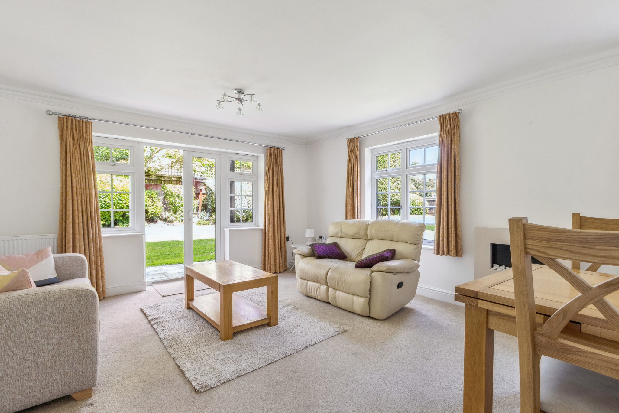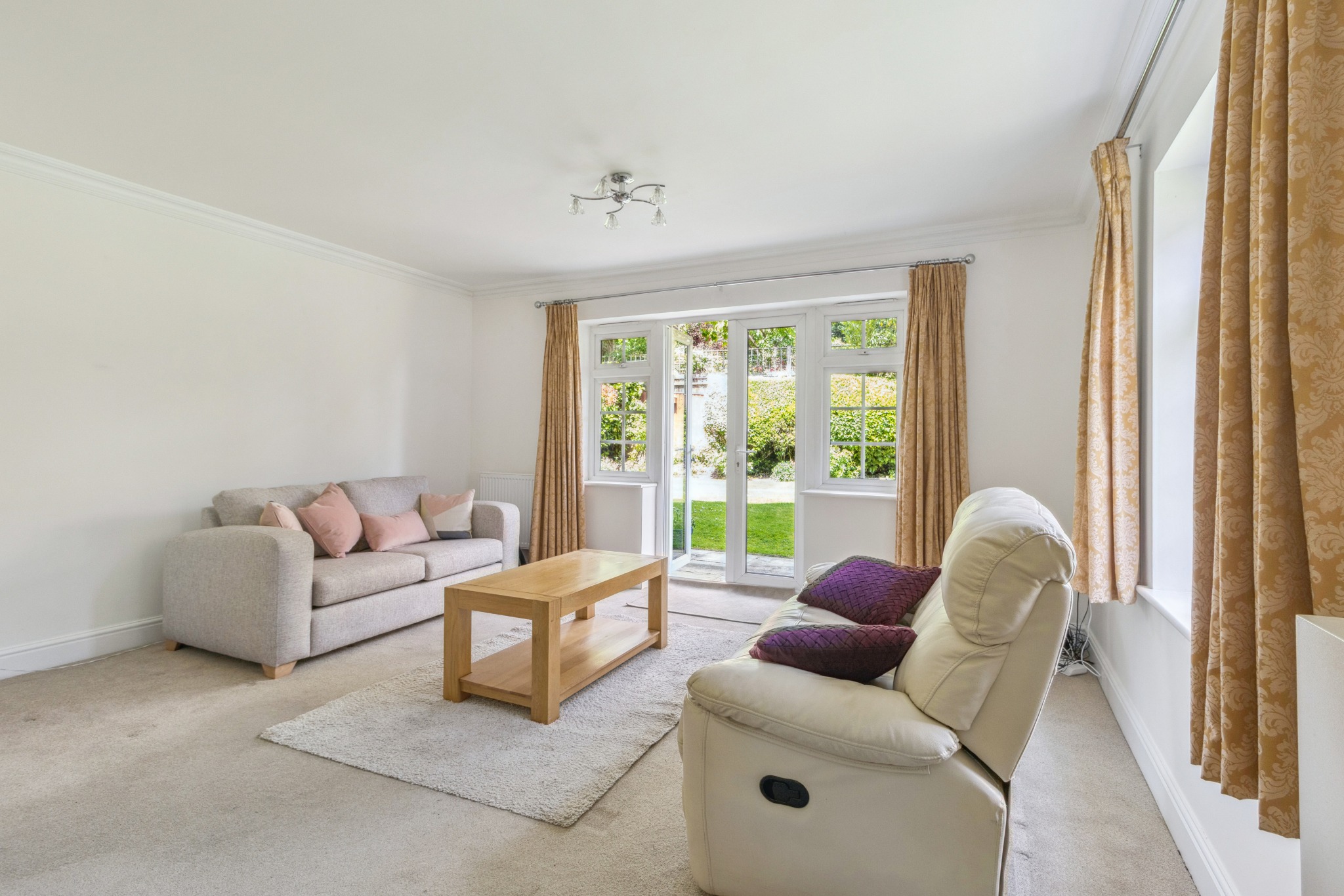 Upon entering, you are welcomed into a bright and spacious living/dining room, featuring double doors that open onto a private patio seating area, perfect for outdoor relaxation. There is a modern fitted kitchen, a family bathroom, and two good-sized double bedrooms with the main bedroom benefitting from an ensuite shower room.