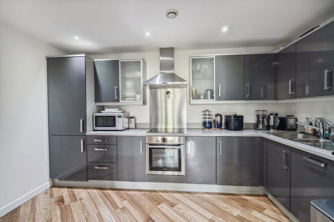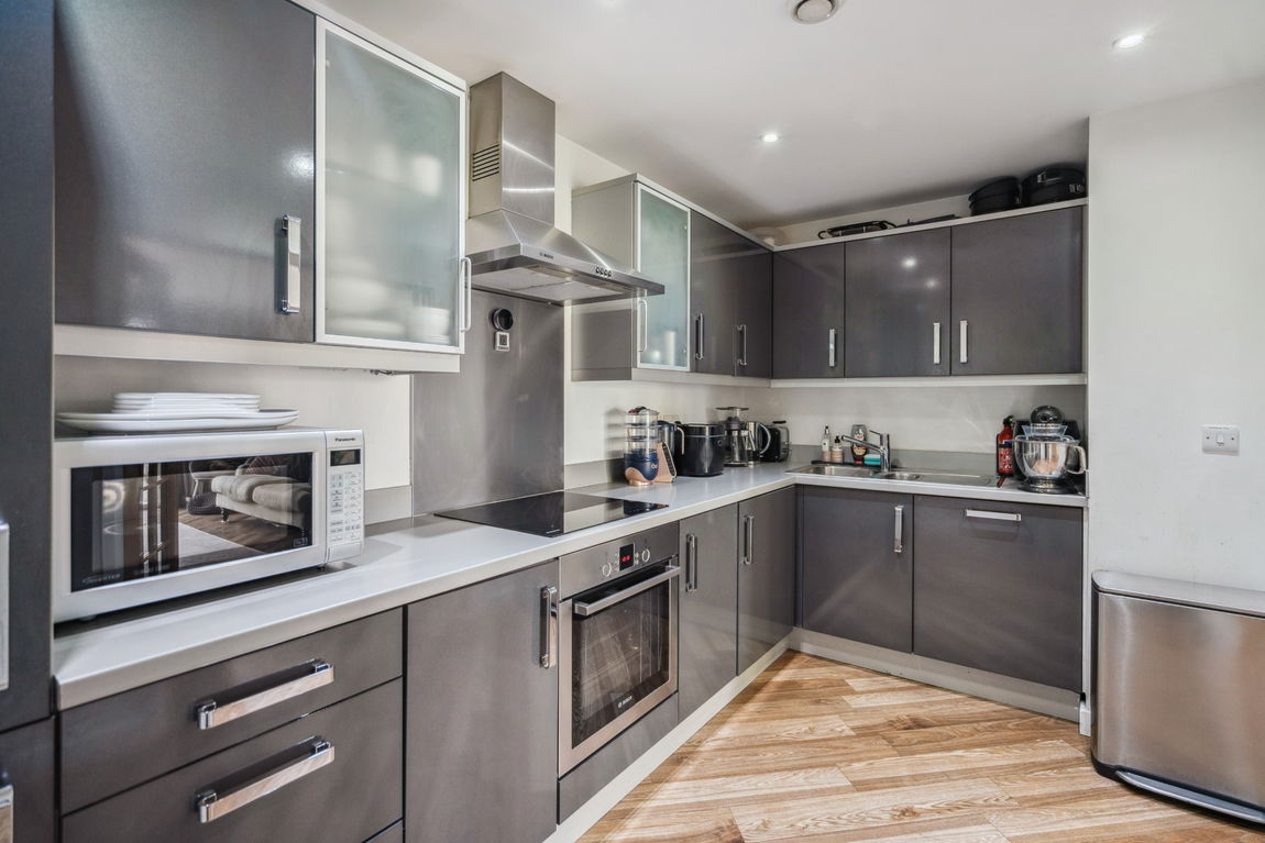 The apartment comprises a generous reception room benefiting from a private balcony, a contemporary kitchen with plenty of storage space and integrated appliances, a double bedroom with a fitted walk-in wardrobe, a luxury four-piece family bathroom, and a shelved larder/storage cupboard. The apartment benefits from x1 allocated parking bay within a gated, underground car park, as well as x2 visitors bays and access to a communal garden.