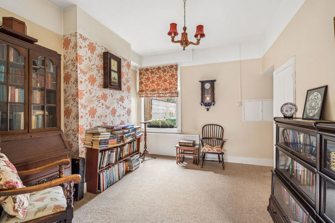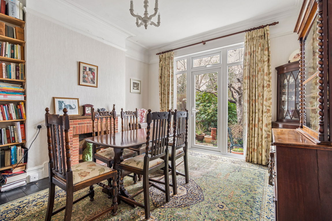 You are welcomed into the property via a porch that opens onto a central hallway, complete with a convenient guest WC. The double-aspect reception room is bright and airy, featuring charming fireplaces and plenty of space for relaxing or entertaining. The kitchen is fitted with a selection of units and offers space for freestanding appliances, with direct access to the rear garden. Completing the ground floor is a dining room with a French door opening out to the garden.
