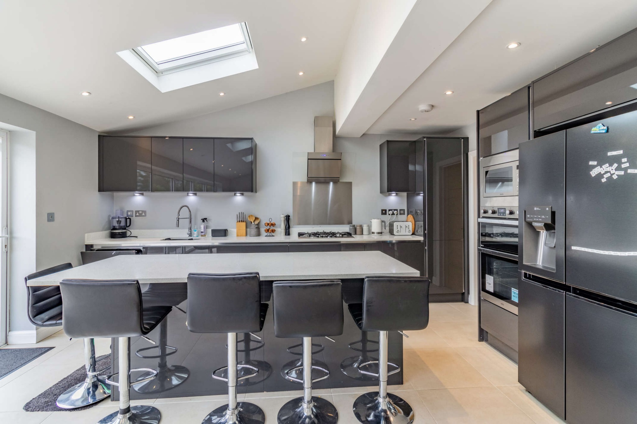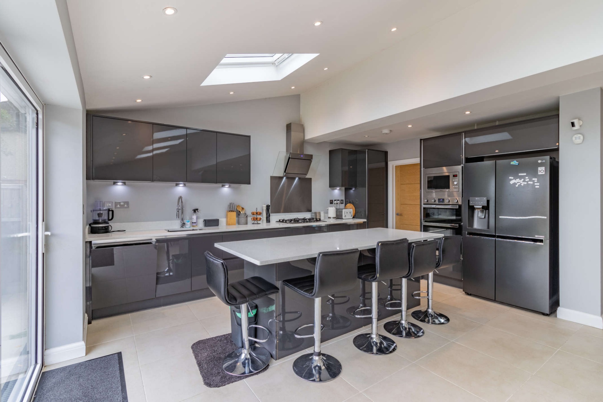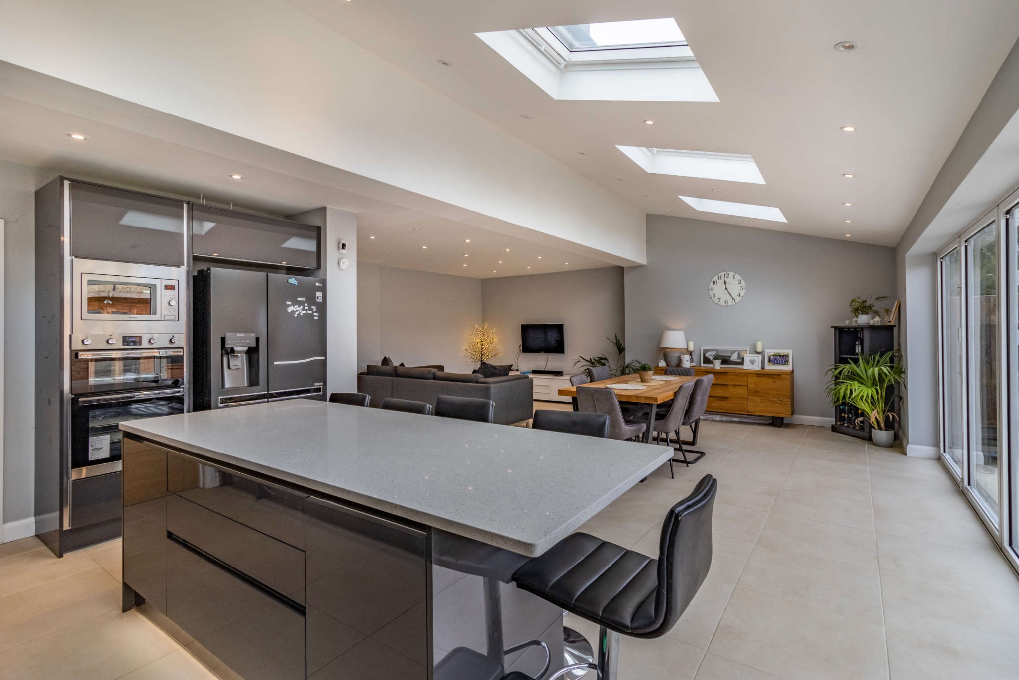 To the ground floor is a light and bright open plan kitchen/ dining/family room, the kitchen is fitted with a range of high gloss units providing ample storage space, with integrated appliances and a central island feature. There is ample room for both dining table and chairs and sofas, making this a wonderful family space. There is also a separate lounge, study utility room and cloakroom.