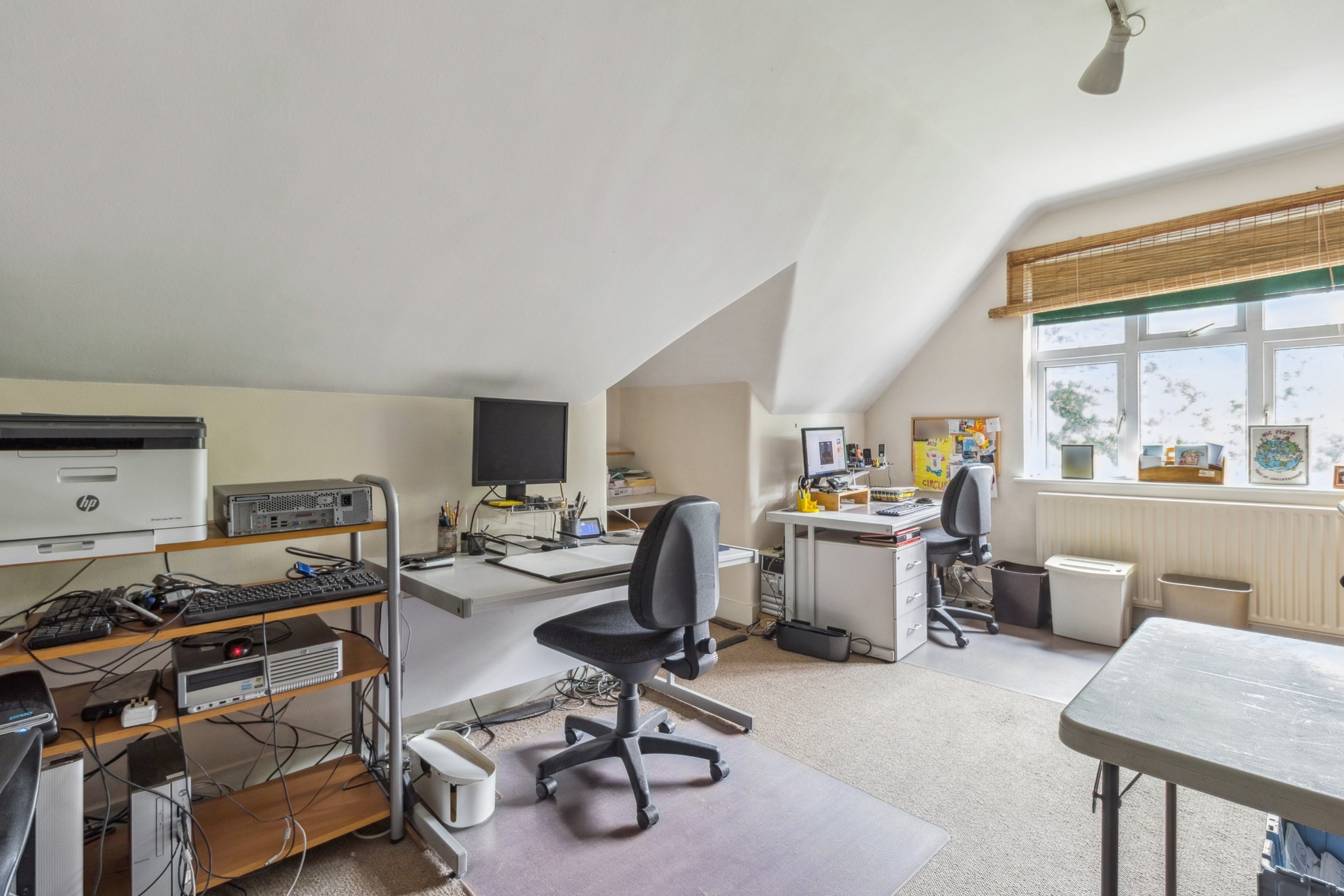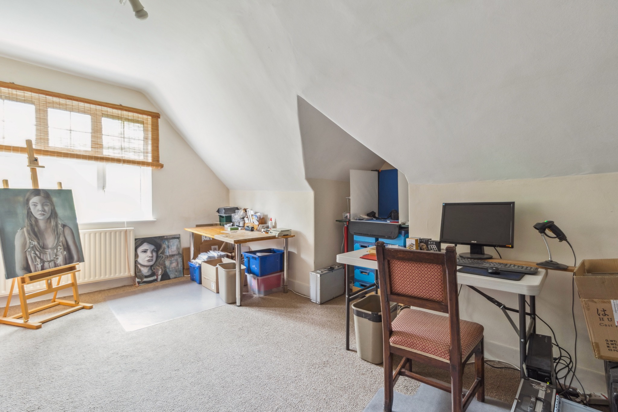 To the rear, a secluded garden provides a peaceful outdoor retreat, complete with a large outhouse offering space for a workshop, studio, or further storage. The front of the property boasts driveway parking and access to the garage.