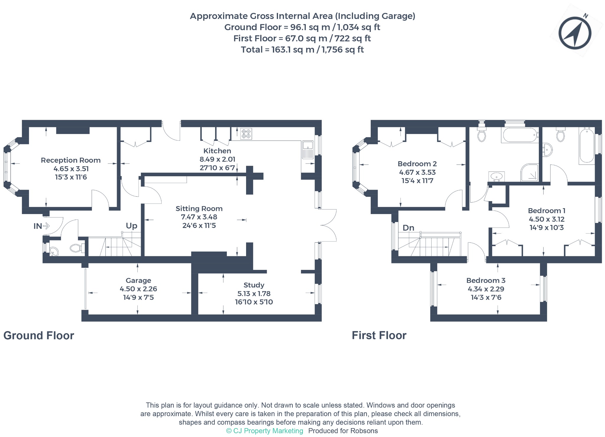 The property comprises an entrance hallway and guest cloakroom, two/three reception rooms, a study, and a modern fitted kitchen with integrated appliances. The first floor hosts a principal bedroom with an en-suite bathroom, two further double bedrooms, and a four-piece family bathroom. Two of the three bedrooms also benefit from fitted wardrobes.