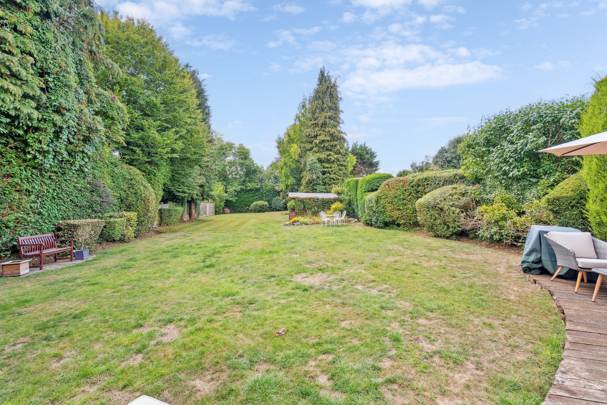 To the rear, the generous, private garden is laid mainly to lawn, bordered by mature trees and hedges for privacy, and includes a patio area ideal for outdoor dining and relaxation. The front of the property features a driveway providing off-street parking for multiple vehicles, a well-tended garden, and access to the integral garage.