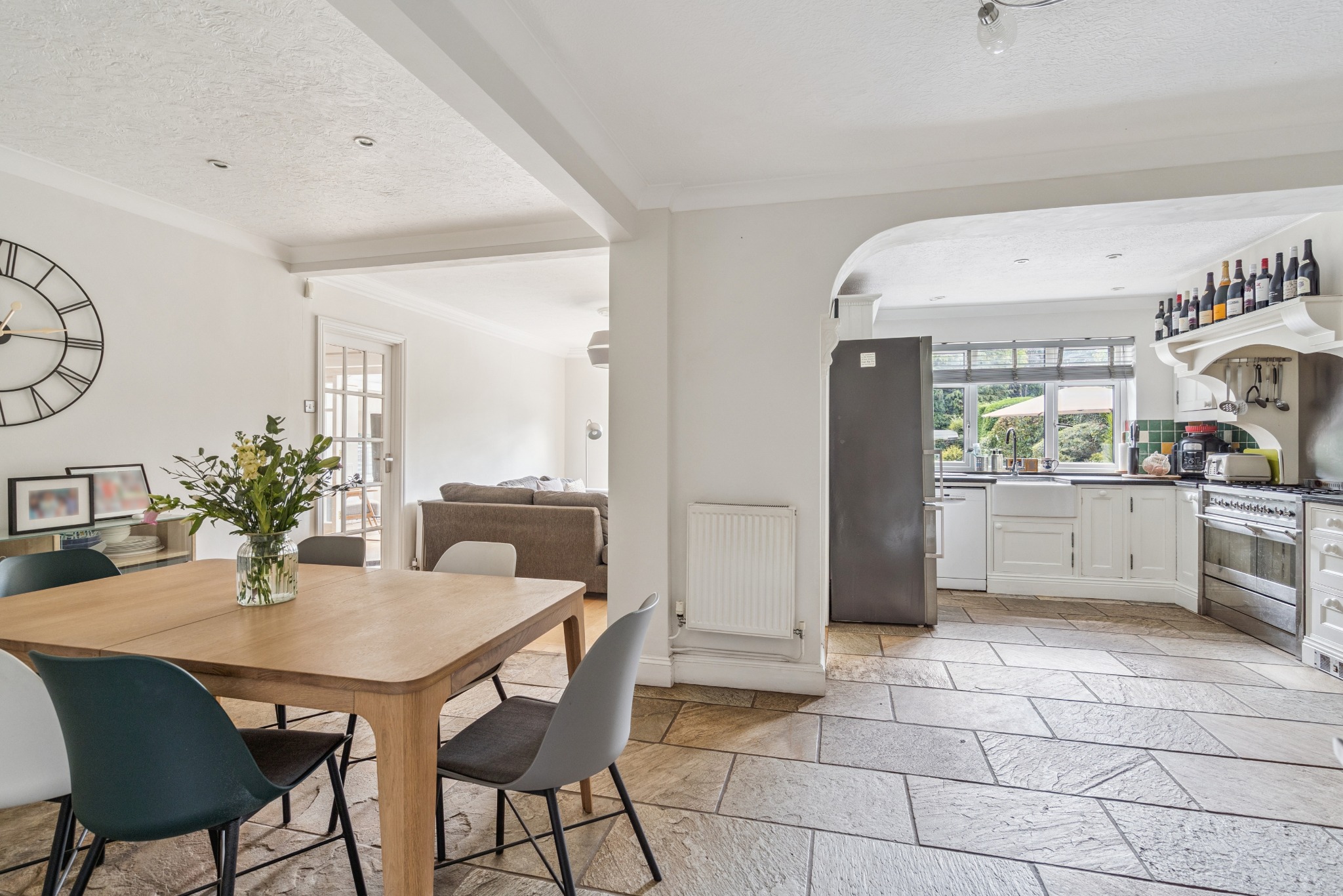 The kitchen is well-appointed with a wide selection of fitted units, integrated appliances, and a practical layout for both everyday cooking and entertaining. Adjoining the kitchen is a useful utility room, offering further garden access as well as an internal door to the garage.