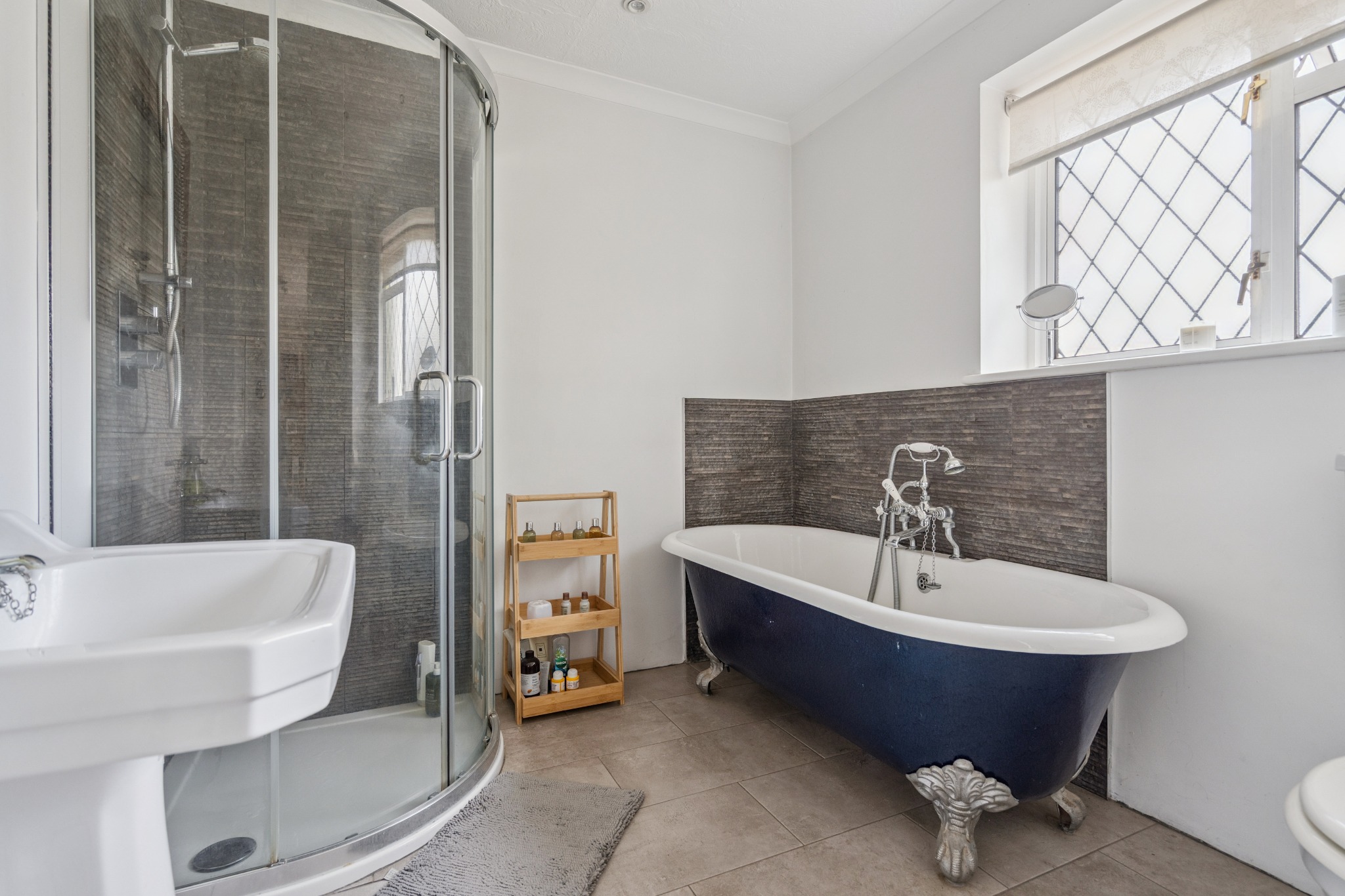 Upstairs, the principal bedroom benefits from an en-suite shower room. Three further bedrooms are served by a stylish family bathroom, complete with a roll-top bath and separate shower.