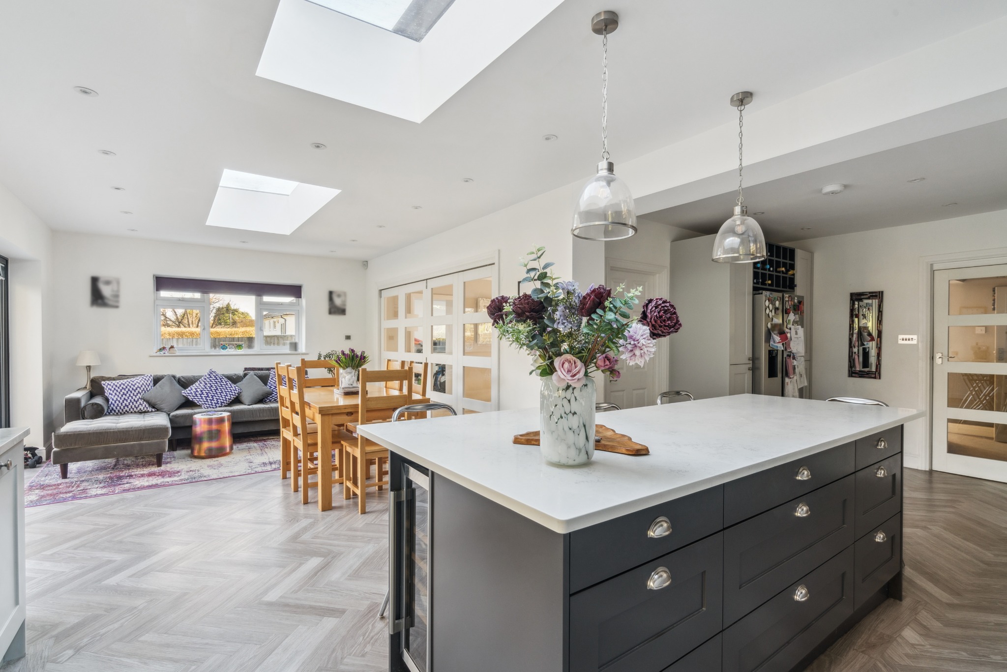 The kitchen offers modern fitted units providing ample storage space, integrated appliances including a wine cooler and a large kitchen island/breakfast bar. Completing the ground floor is a third reception room with a skylight.