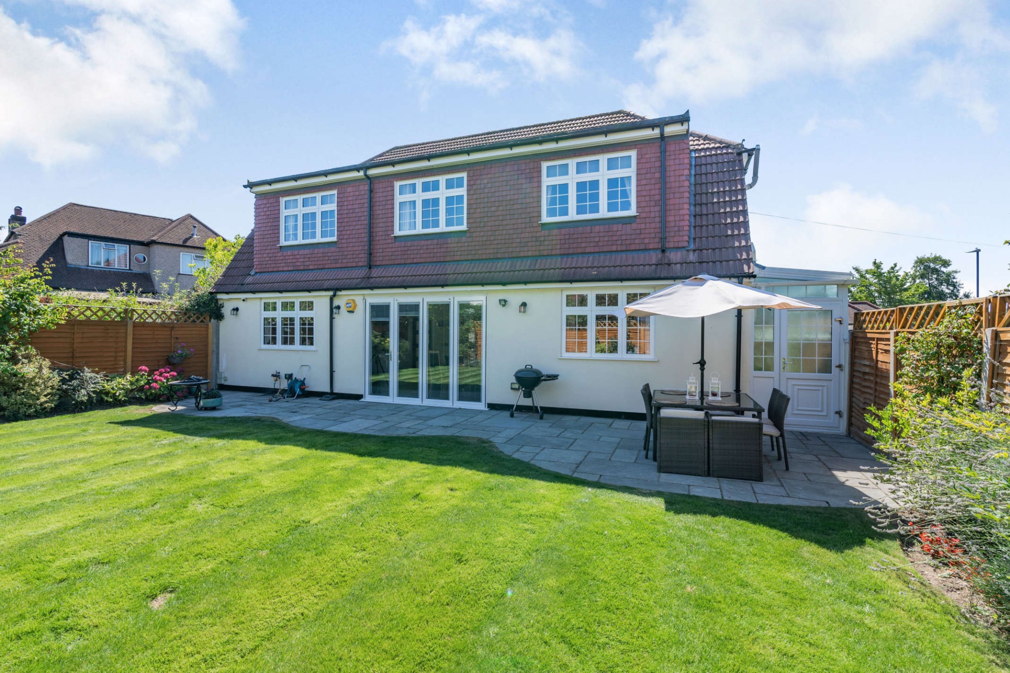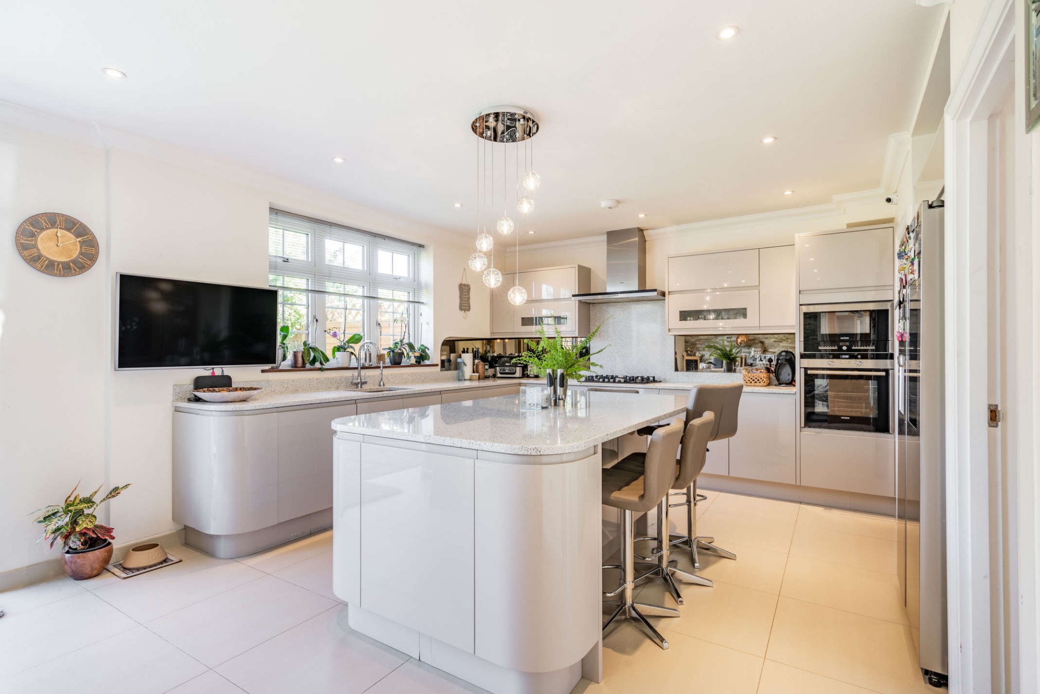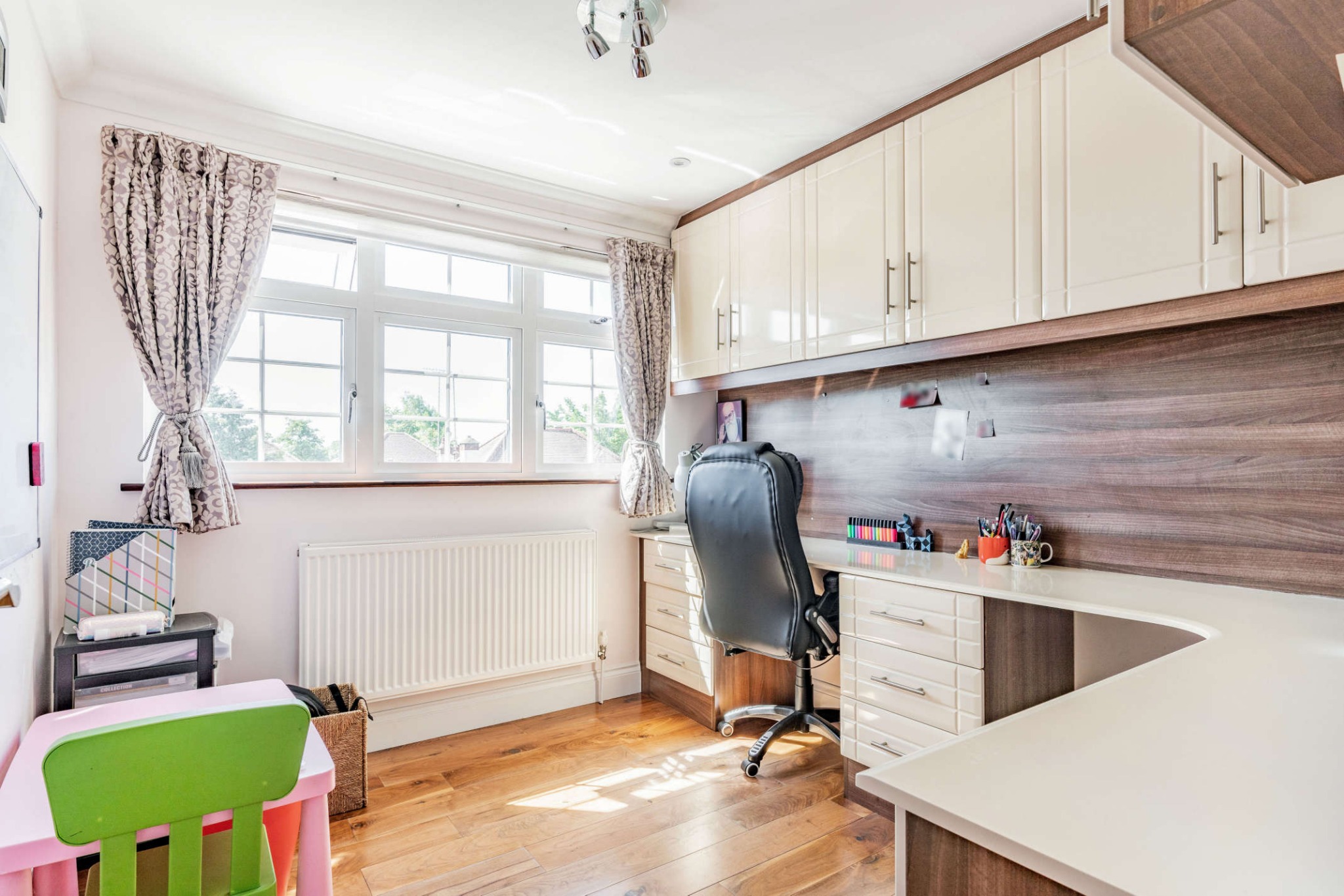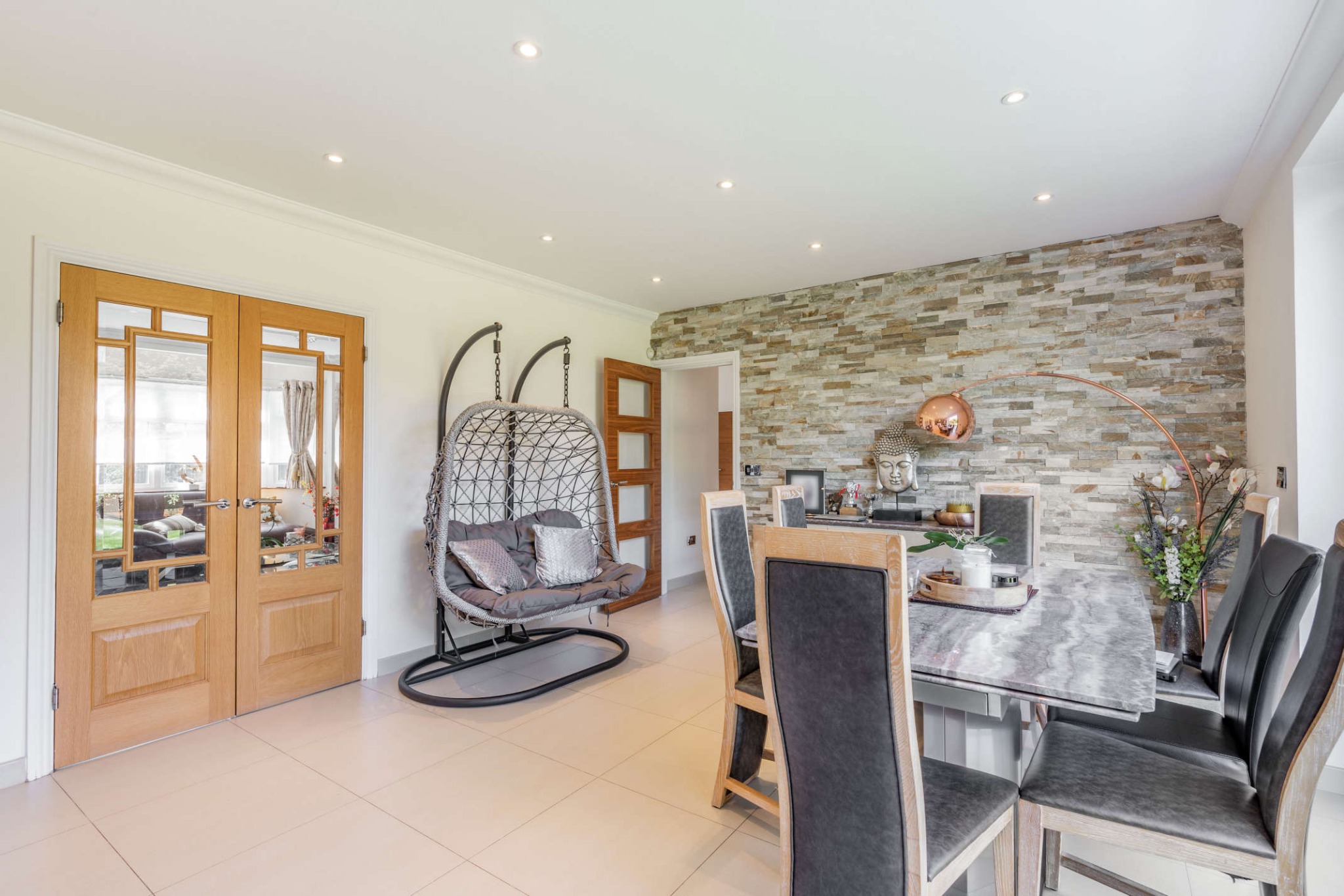 The ground floor comprises a generous entrance porch leading to a welcoming hallway with a guest cloakroom. There is an impressive, front aspect sitting room with a bay window, a separate TV / family room, and a study with fitted units. Completing the ground floor is a sizeable kitchen/dining room that is flooded with natural light and has bi-folding doors opening out to the garden patio, perfect for entertaining in the summer months. The kitchen features tasteful, neutral units providing plenty of storage space, integrated appliances, a large kitchen island and access to a utility room. To the first floor there are four well-appointed double bedrooms all with fitted wardrobes, and two benefiting from en-suite shower rooms, a further bedroom that is currently utilised as a second study, and a luxury family bathroom.