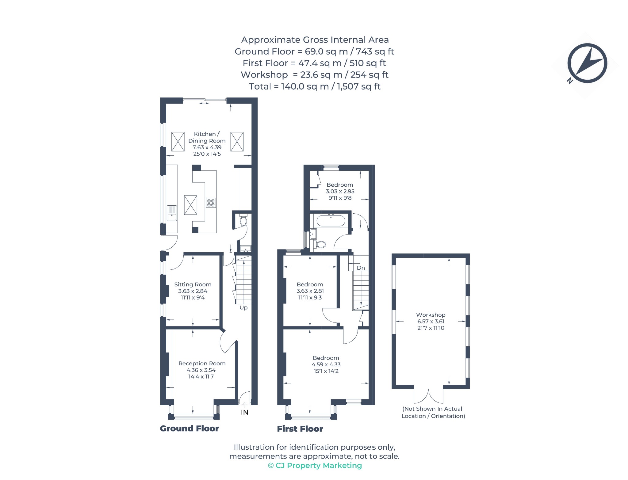 Two double bedrooms are located on the first floor, along with a further bedroom and a three-piece family bathroom. In addition, there is a large workshop to the rear of the garden, complete with power and lighting.
