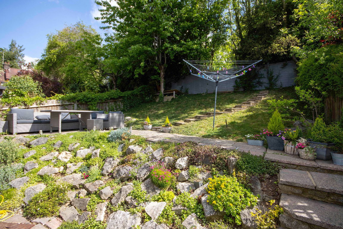 The attractive rear garden is mainly laid to lawn, with mature shrubs and flowerbeds, and a patio area ideal for outdoor dining and entertaining. The front of the property features a private driveway providing off-street parking and access to a useful storage room.