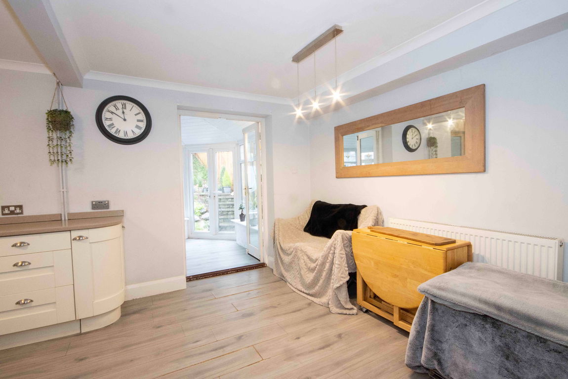 The ground floor comprises an entrance hallway leading to a guest WC and a welcoming front-aspect lounge featuring a fireplace and stairs to the first floor. The kitchen offers a range of fitted units and ample space for freestanding appliances. French doors open into a bright and airy conservatory, perfect for relaxed family living, with further French doors leading to the rear garden and an adjoining ground-floor bedroom or flexible living space.