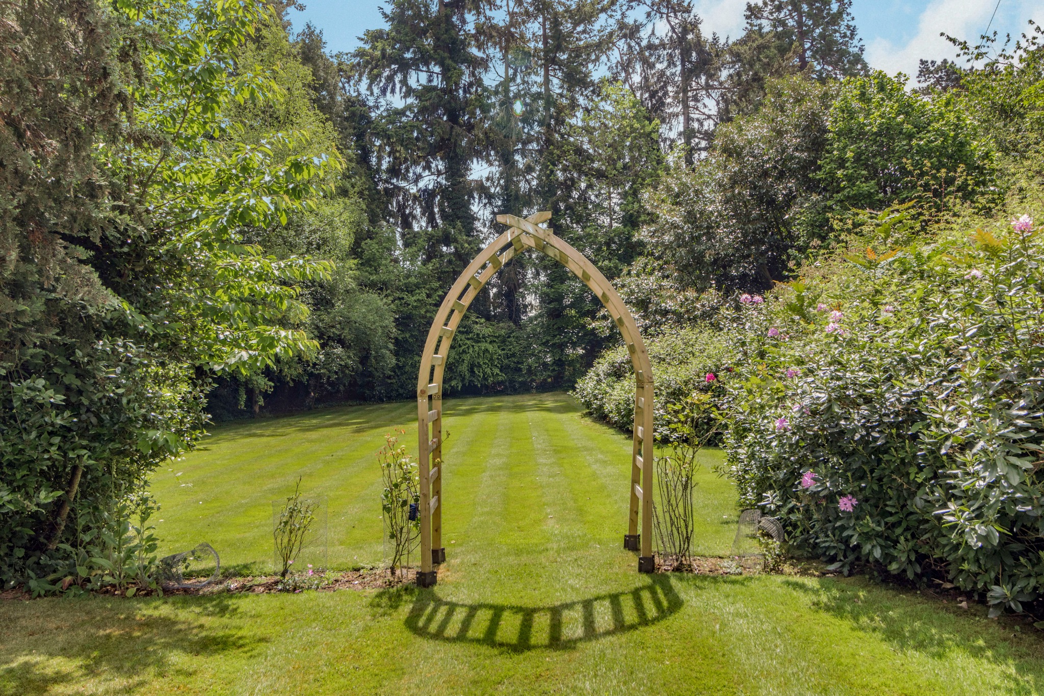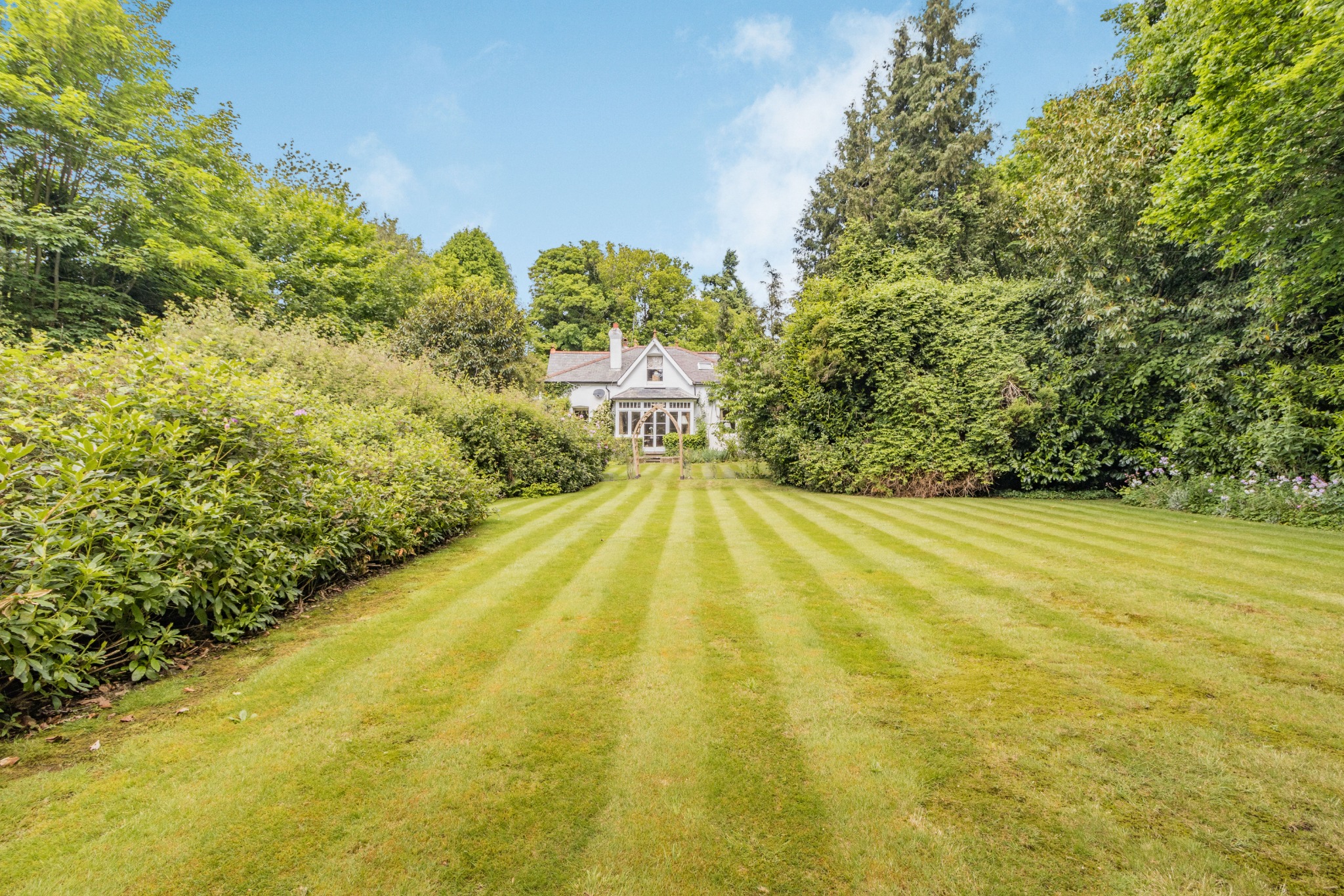 The property is approached via a gated driveway, providing ample parking for multiple vehicles. The extensive gardens provide a large area of lawn through an attractive garden arch and to the other side is a swimming pool and further gardens. There are also two attached garden stores.