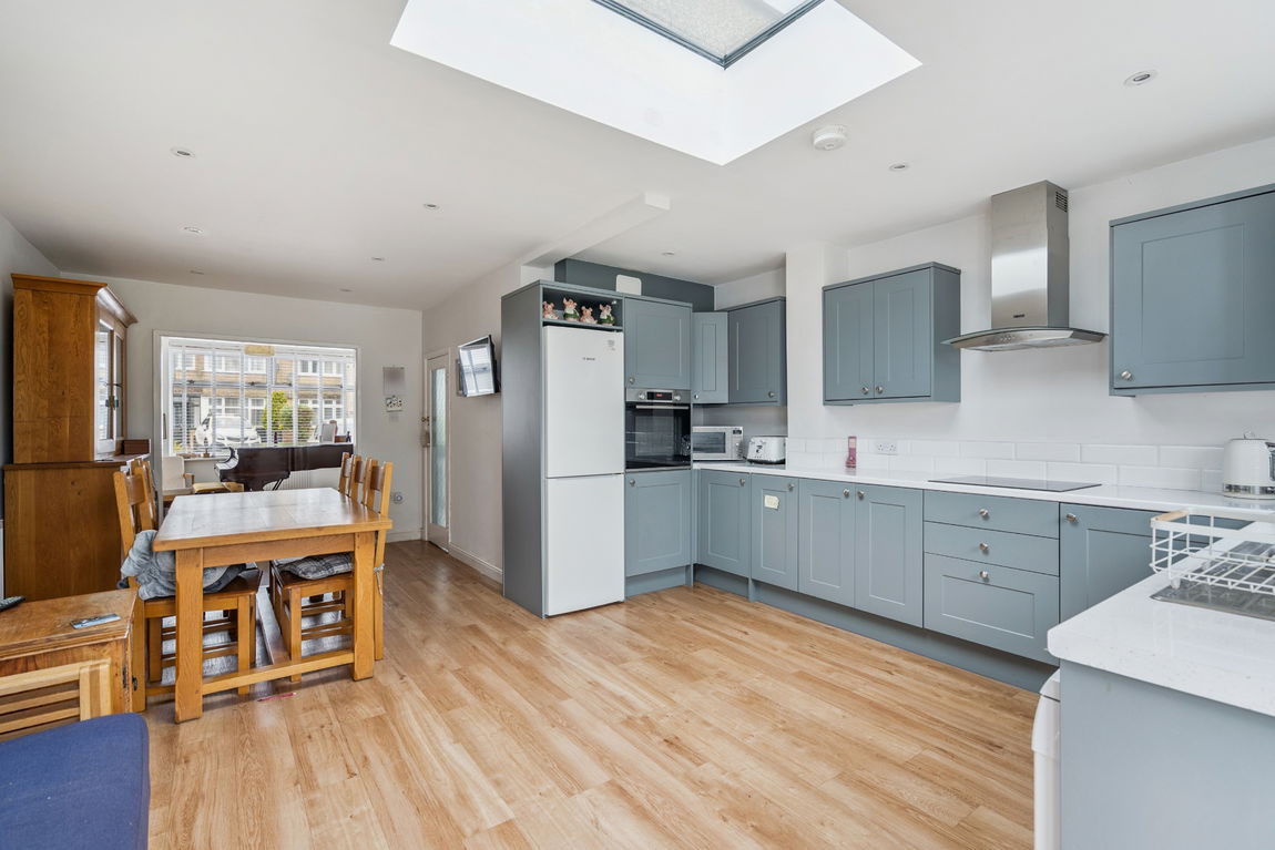 On the ground floor, the property features a welcoming hallway with a guest WC, a bright front-aspect reception room, and a spacious open-plan kitchen/dining room. The kitchen is fitted with a wide range of modern units and integrated appliances, complemented by a large skylight and French doors that open directly onto the rear garden, filling the space with natural light.