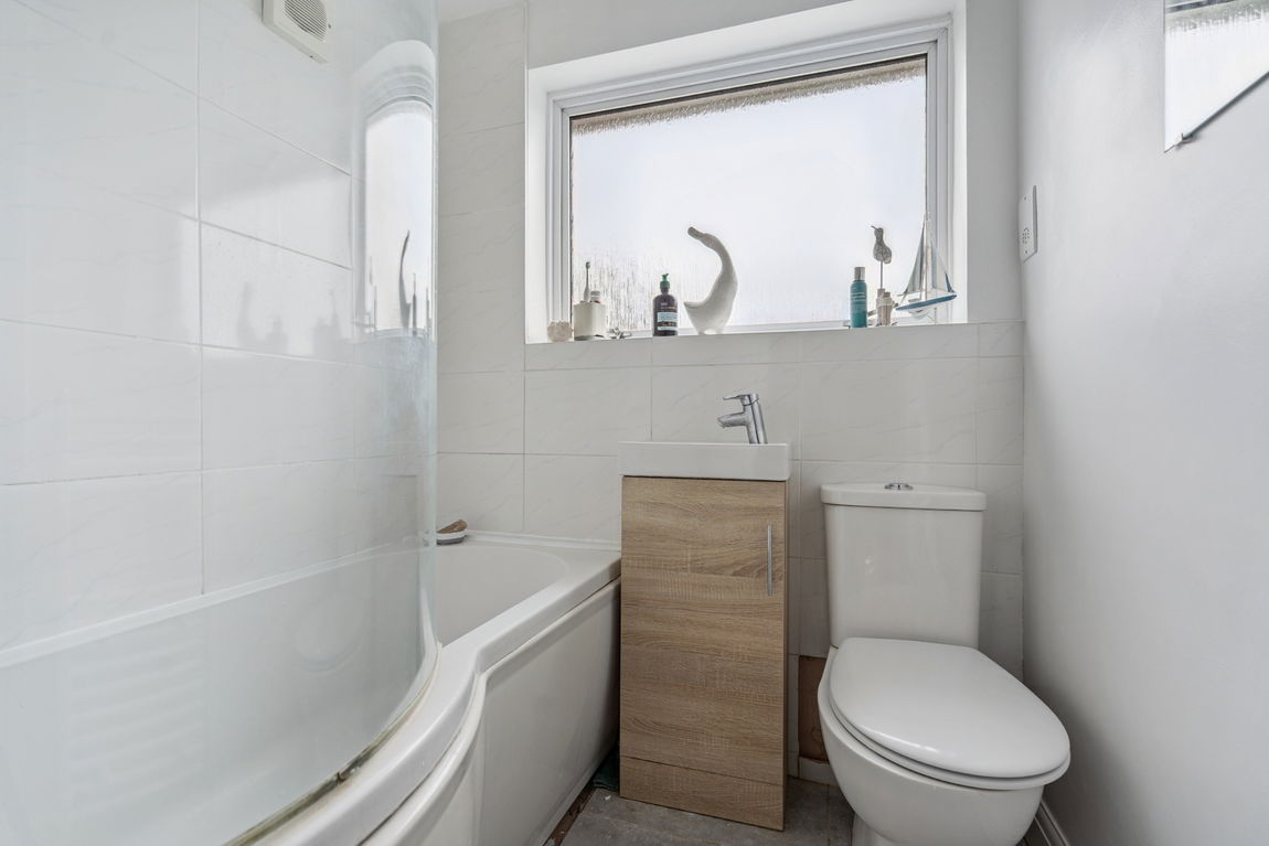 Upstairs, there are three bedrooms served by a family bathroom with under sink storage.