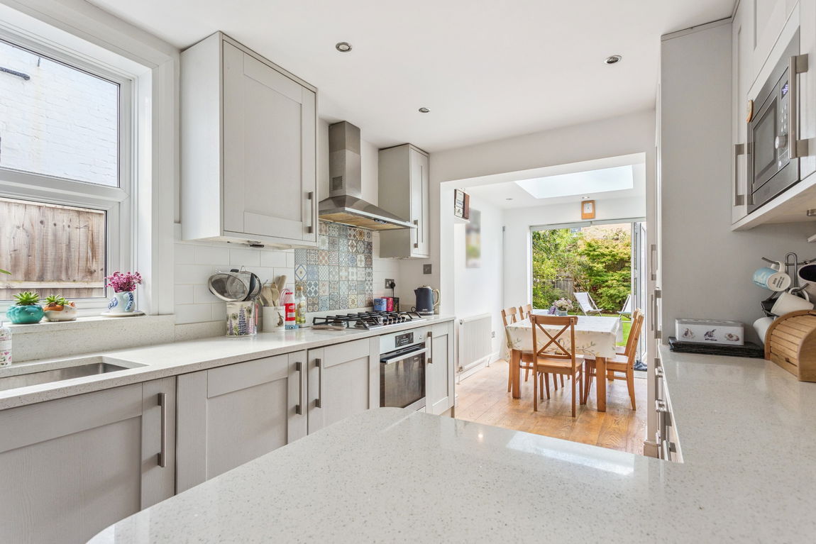 The ground floor comprises a good-sized reception room with useful fitted storage, a guest cloakroom, and a stylish kitchen / diner. The kitchen features modern, neutral units with integrated appliances, whilst the dining area benefits from a large lantern roof and bi-folding doors opening out to the garden.