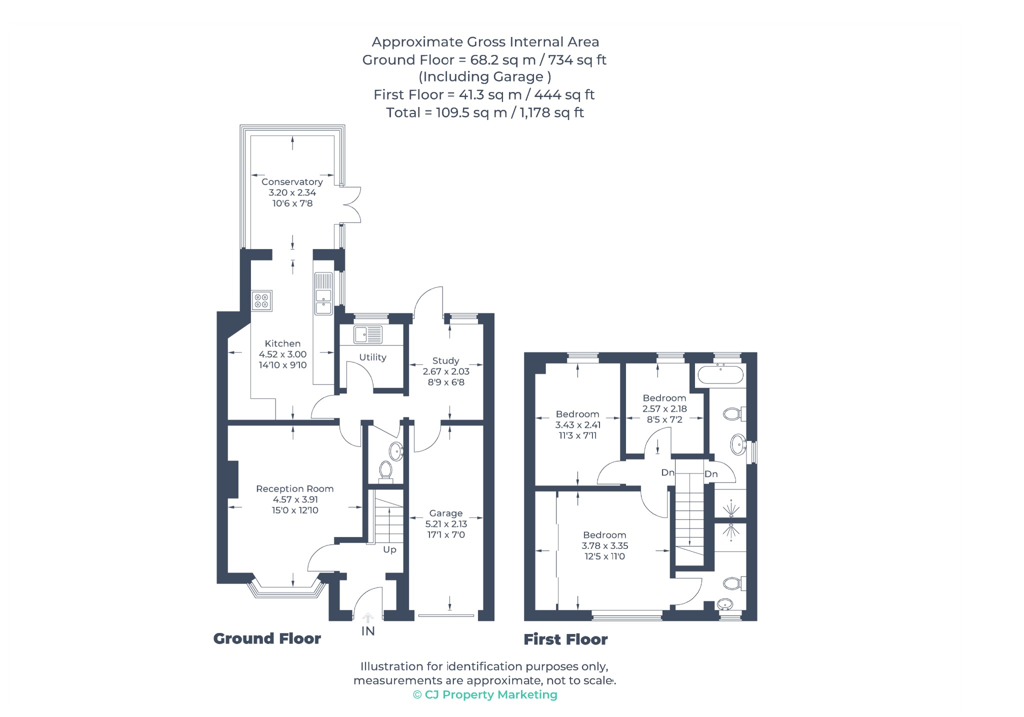 The ground floor is accessed via an entrance hallway leading to a bright and airy front aspect reception room, featuring a large bay window and a feature fireplace. From here, a hallway connects to the well-appointed kitchen, fitted with a range of modern units and integrated appliances, which flows seamlessly into the conservatory. Overlooking the garden, the conservatory enjoys French doors opening onto a patio area, perfect for entertaining and outdoor dining.