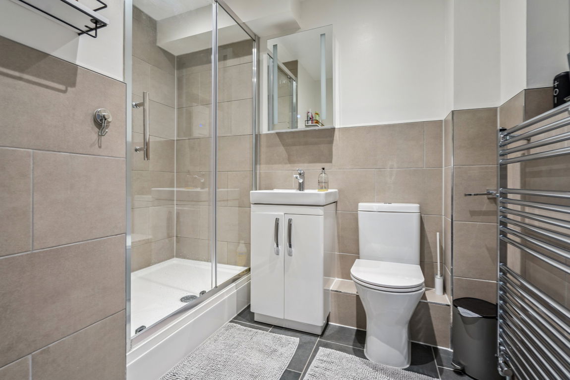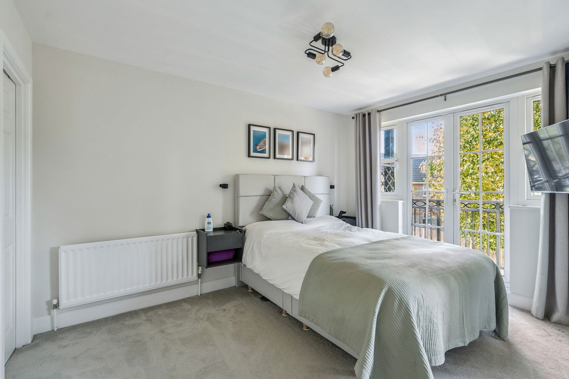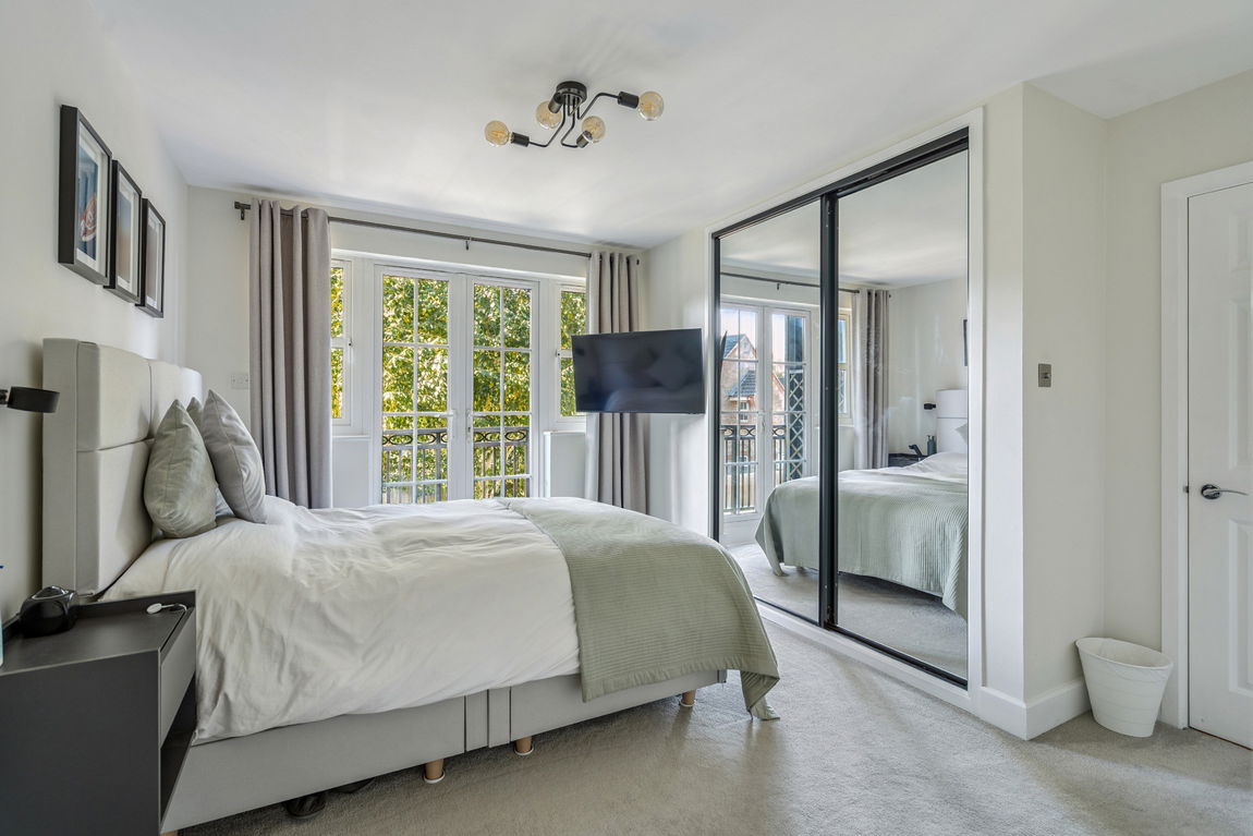 The principal bedroom benefits from sleek fitted, mirrored wardrobes, a modern en-suite shower room, and French doors that open out onto a private balcony.