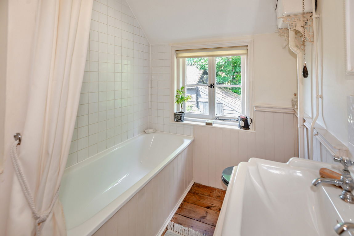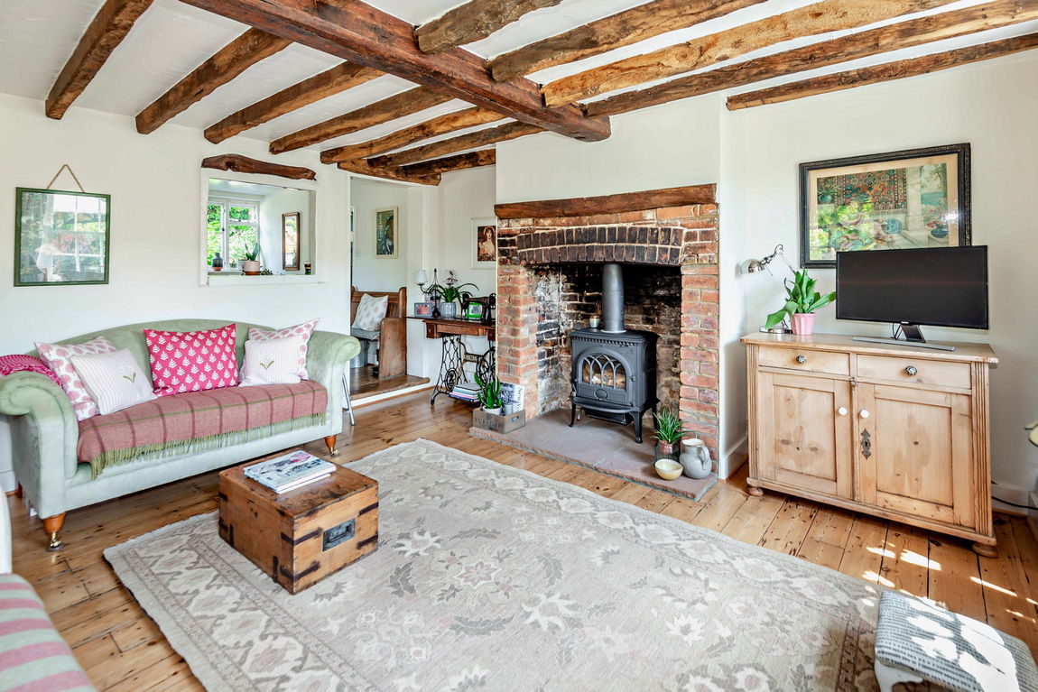 To the first floor there is a principal bedroom with oak beams, wooden floors and double aspects windows with views of the garden, two further bedrooms one with feature fireplace and a family bathroom.