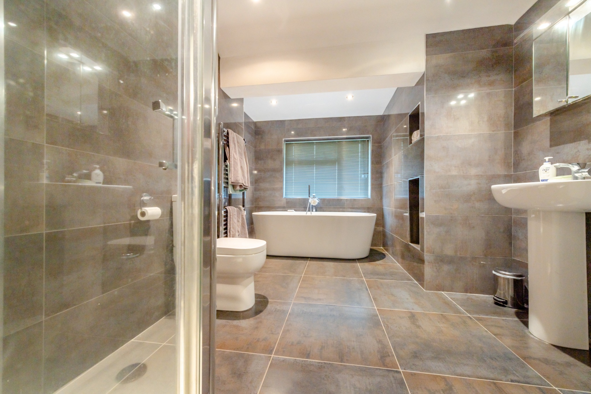 To the first floor, there is a principal bedroom with fitted wardrobes and ensuite shower room, four further good sized bedrooms and a sizeable, modern fully tiled bathroom with roll top bath, walk in shower and spotlights.