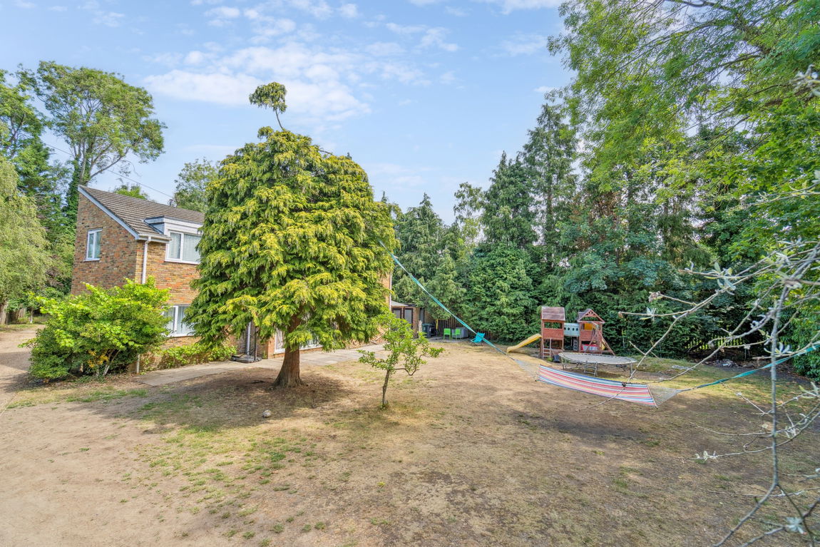 The private rear garden is mainly laid to lawn and surrounded by mature trees and hedges, creating a secluded setting. The spacious driveway offers ample off-street parking, and the property benefits from both a double and a single garage.