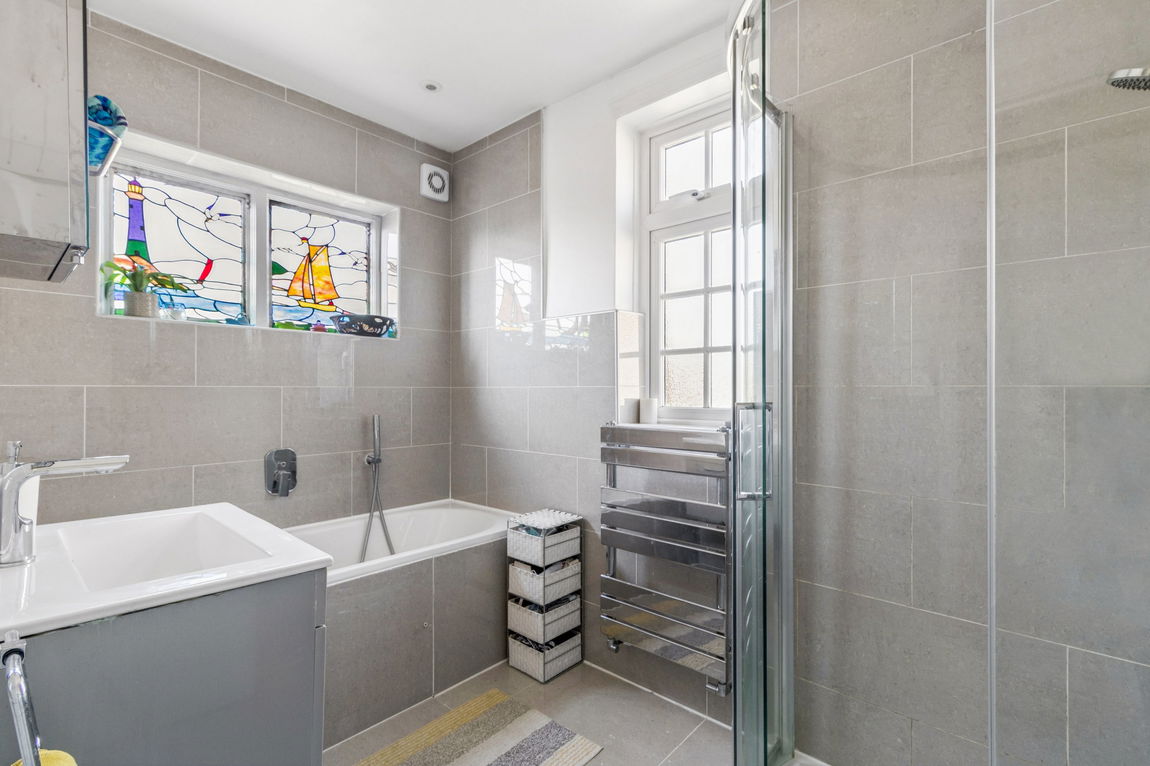 Upstairs, the property offers two double bedrooms, one of which benefits from fitted wardrobes and a single bedroom. A modern fully tiled family bathroom features both a bath and shower, complemented by a separate WC.