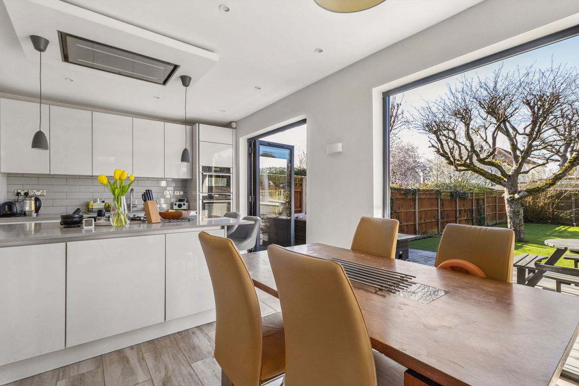 The ground floor comprises a welcoming entrance hallway with a useful storage cupboard and access to a front-aspect living room featuring a charming bay window and an attractive log burner. To the rear, a spacious and modern kitchen/dining room provides a wide range of sleek fitted units, integrated appliances, and a central kitchen island offering additional worktop and storage space. There is also ample room for a dining table and chairs. Two sets of bi-fold doors open directly onto the garden, creating entertaining and family living.