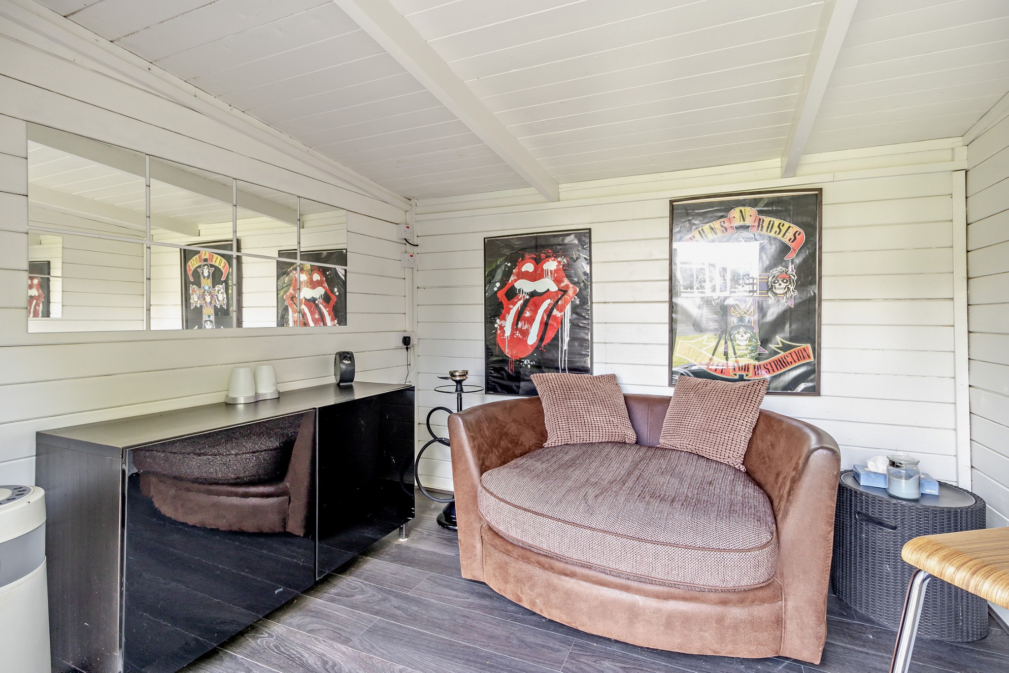 On the ground floor is an enclosed porch leading to the hallway then lounge featuring a fireplace. Alongside is a modern kitchen leading to a large conservatory with an insulated roof and air conditioning overlooking a South-West facing garden, two double bedrooms, one with en-suite and a family bathroom. Upstairs are two further bedrooms, one with a spacious four piece en-suite. The newly installed front drive has space for four cars. The garden is landscaped to offer a manicured lawn with a well lit decking area along with a summer house and storage.