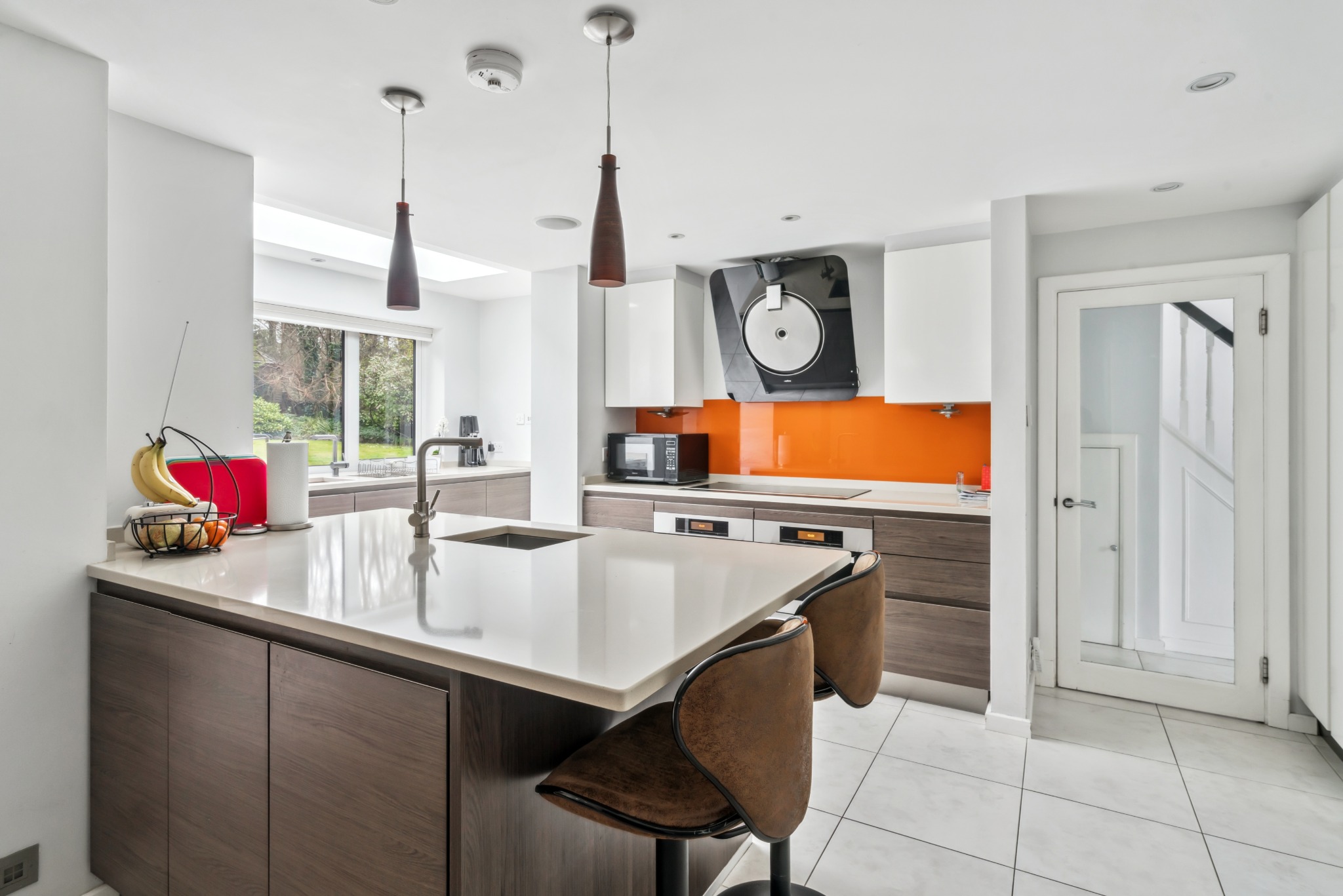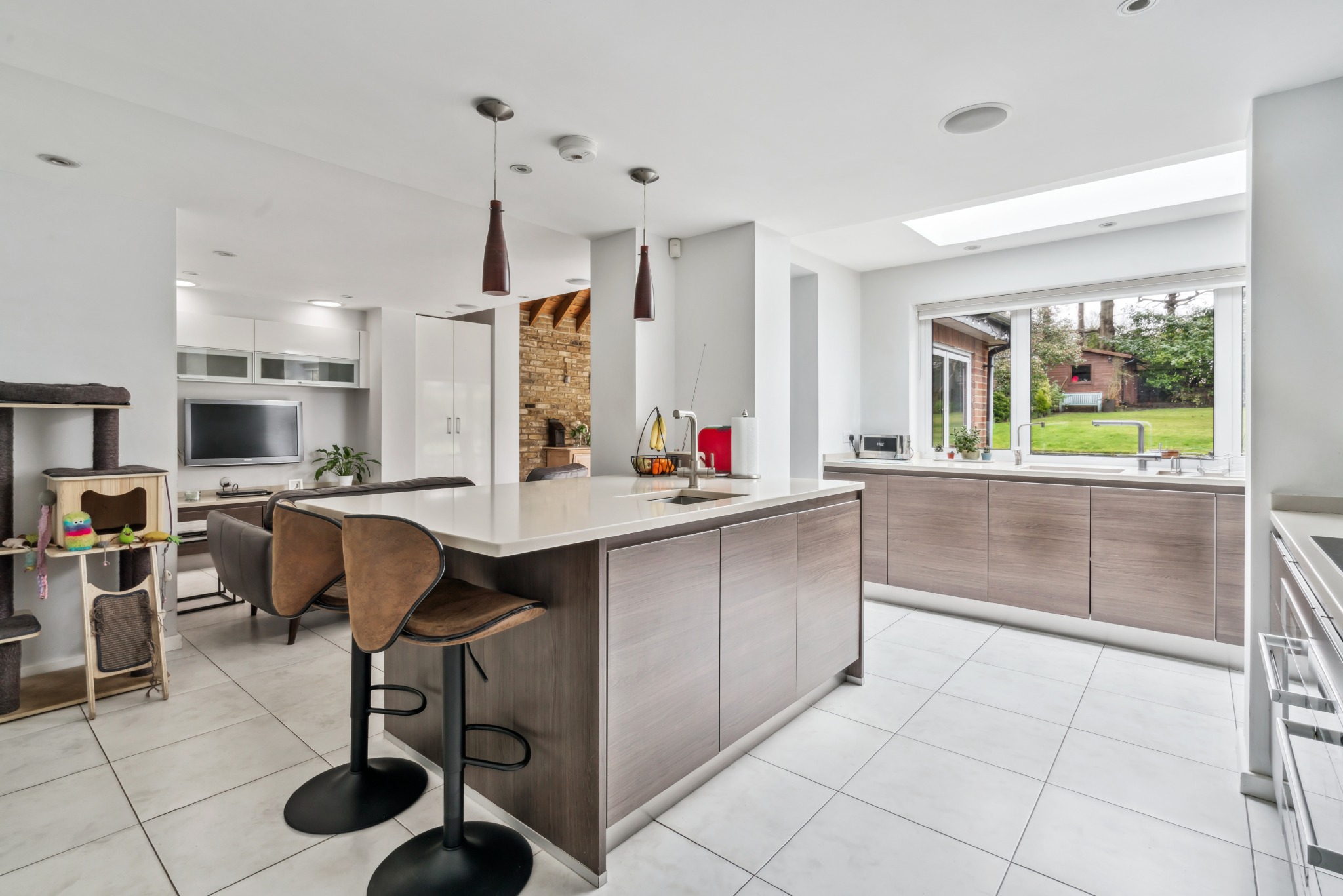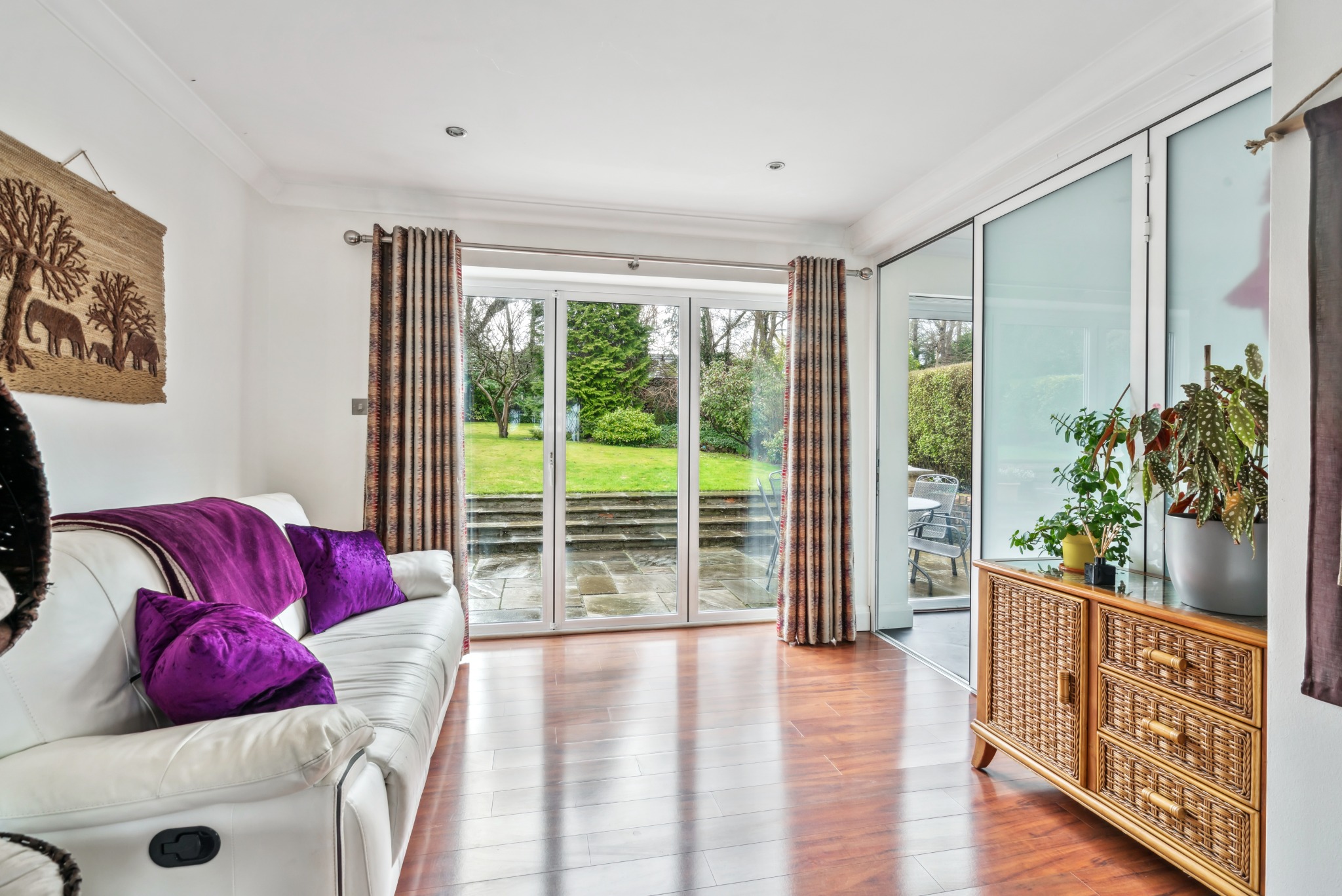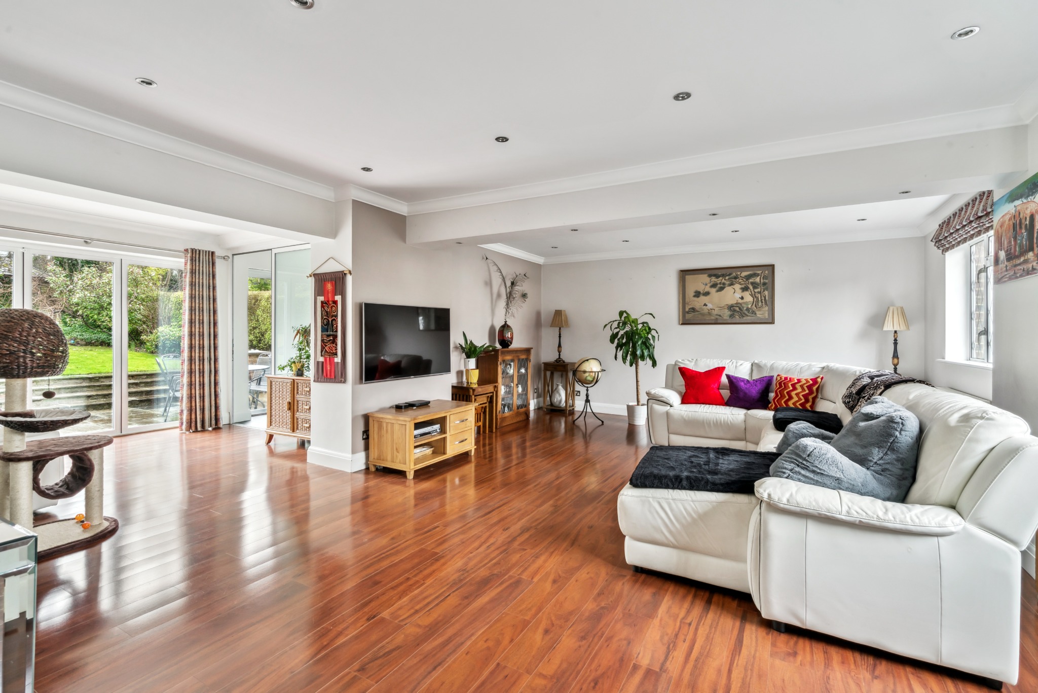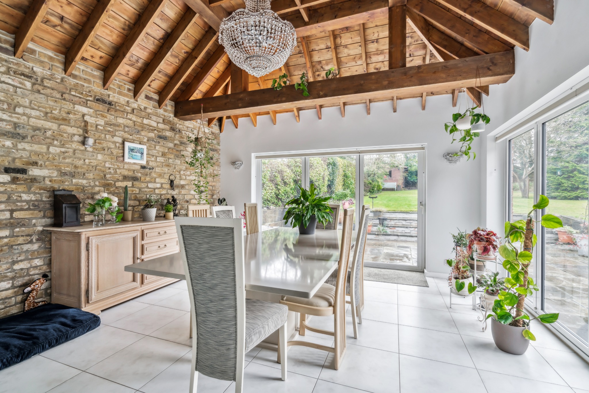 This spacious family home comprises an entrance porch, opening through to a welcoming entrance hall, with fitted study, and a ground floor shower room and wc. To the front aspect is a spacious double-width living room, which flows through to another reception with internal bi-fold doors to give the option of creating an additional dance studio / play room.The hub of the home is a stylish, open-plan kitchen/dining/family room, featuring an island with integrated sink, contrasting brown and white fronted cabinets, finished with white/cream granite worktops and integrated appliances. There is space for a sofa in front of the TV area, which opens into a beautiful dining room with high vaulted beamed ceilings and bi-fold doors providing views and access to the attractive rear garden. Completing the ground floor is a separate utility room with internal door to the garage.