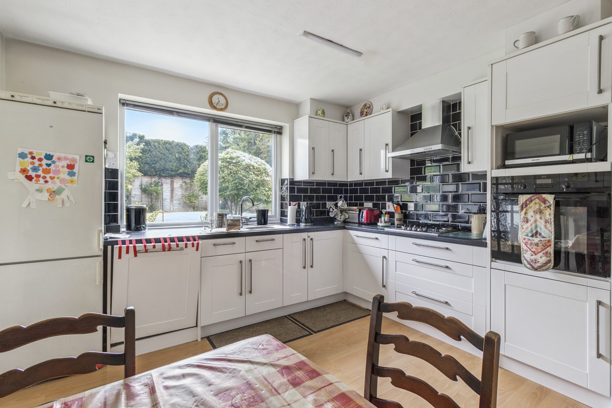Outside, a private rear garden with a patio area offers an excellent space for outdoor dining and relaxation. To the front, there is off-street parking and a double garage providing ample storage and convenience.